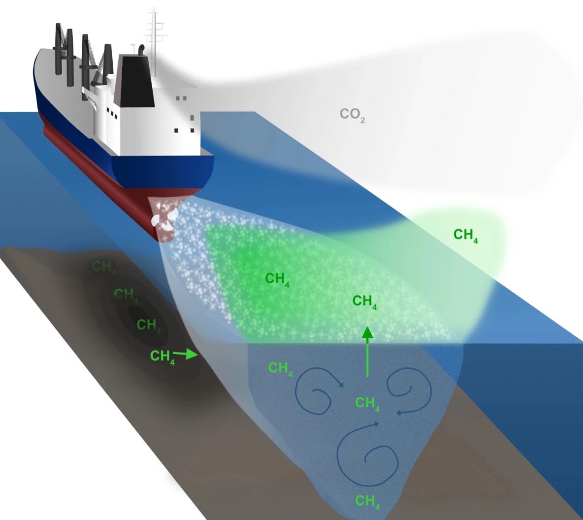 Badania prowadzone przez Chalmers University of Technology w Szwecji, a następnie opublikowane w Communications Earth & Environment, wykazały, że statki poruszające się po płytkich wodach mogą powodować emisje metanu znacznie wyższe od wcześniej zakładanych poziomów. Związany z tym proces jest pozornie prosty – statki przepływające nad osadami bogatymi w metan wzburzają dno morskie poprzez wahania ciśnienia i turbulencje. To prowadzi do uwolnienia rozpuszczonego metanu z warstw ubogich w tlen, bogatych w materię organiczną, a następnie do jego dyfuzji do atmosfery.