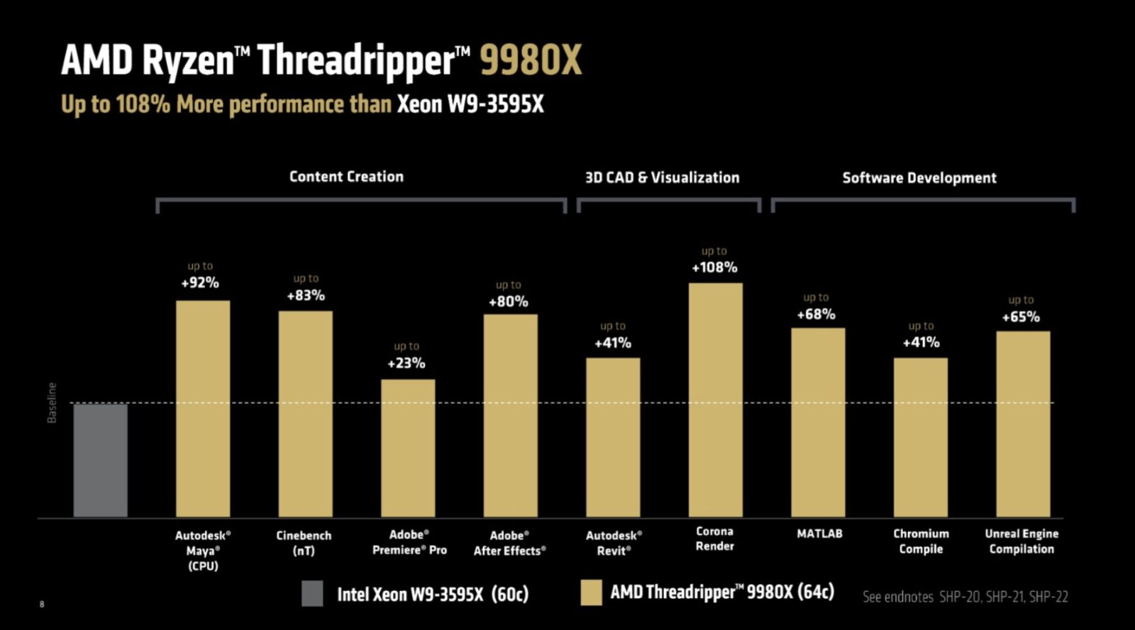 W testach AMD chwali się, że Threadripper 9980X potrafi być nawet 83% szybszy od Intel Xeona W9-3595X w Cinebench 2024, a w praktycznych zastosowaniach związanych z tworzeniem treści (Corona Renderer, Autodesk Maya, Unreal Engine) różnica dochodzi nawet do 108%. Trzeba uczciwie przyznać, że firma nie podała dokładnych liczb, ale nawet przy zachowaniu rezerwy tego typu liczby oznaczają bardzo poważny wzrost możliwości procesorów i to zwłaszcza w niszy, gdzie czas to tak naprawdę pieniądz.