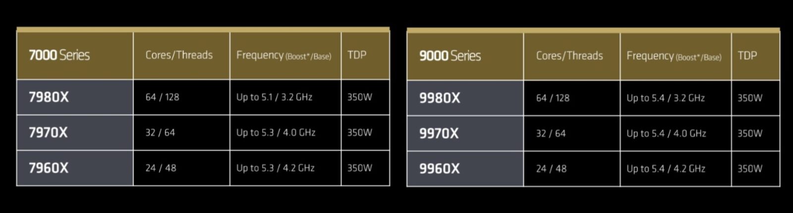 - Threadripper 9980X: 64 rdzenie/128 wątków, 3,2 GHz/5,4 GHz (boost), TDP 350 W