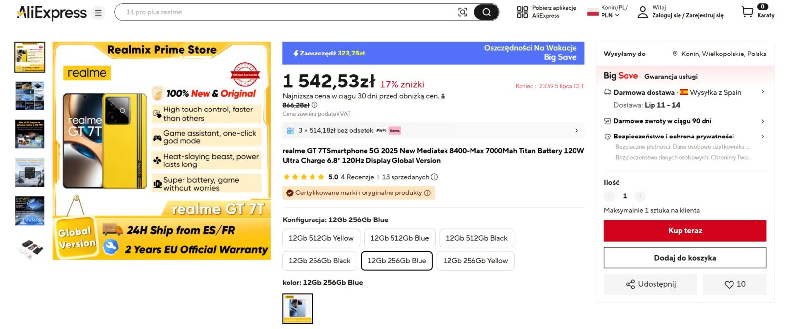 Aby kupić Realme GT 6T w niezwykle atrakcyjnej cenie, należy udać się do serwisu AliExpress. Promocyjna cena wynosi w tej chwili 1542,53 i jest, jak wskazuje Ceneo, o około 1000 zł niższa niż cena z polskiej dystrybucji. Towar wysyłany jest z Hiszpanii, więc odpada zabawa z cłami i podatkami, trzeba się natomiast uzbroić w nieco cierpliwości, gdyż dostawa może trwać do 10 dni. Link do oferty znajdziecie tutaj, o ile mogę sprawdzić, dostępne u tego samego sprzedawcy są kolory czarny, żółty i niebieski.