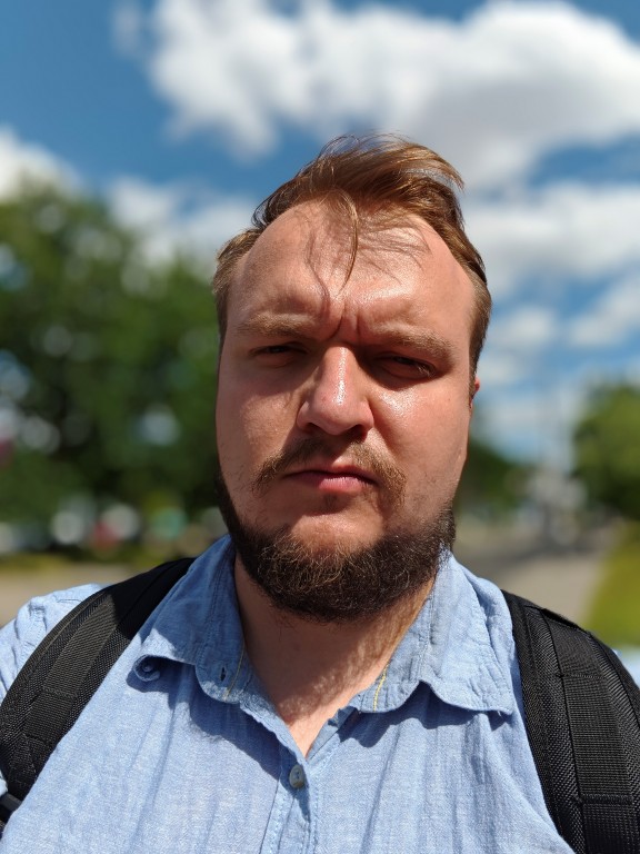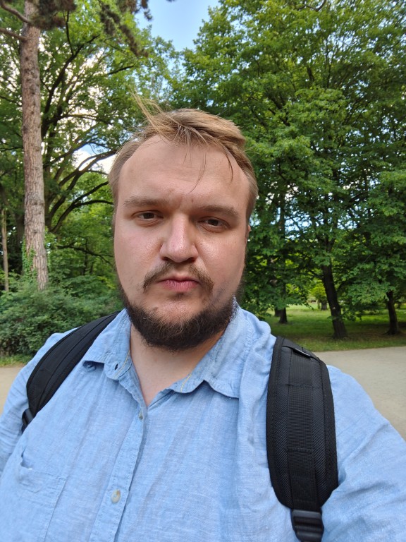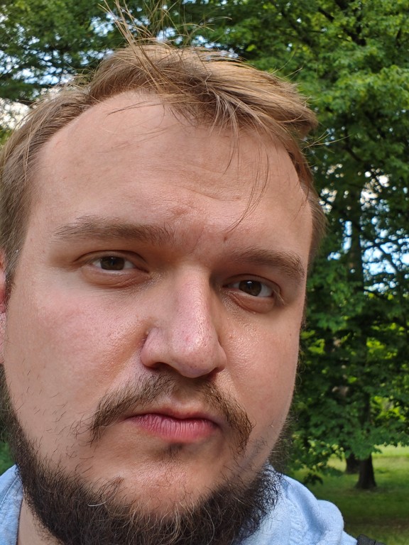 Przedni aparat dzięki wysokiej rozdzielczości rejestruje zdjęcia z dużą ilością detali. Dla równowagi potrafi też przepalić tło w sposób nieakceptowalny, choć to zdarza się tylko przy szybkich, niepozowanych zdjęciach zaraz po jego przełączeniu. Jeśli damy mu czas, zarejestruje fotografie, w których cera zachowuje swoją porowatość, ale staje się nieco pomarańczowa. Oprogramowanie należy za to pochwalić za odcięcie twarzy od zdjęcia, bo to jest naprawdę udane.