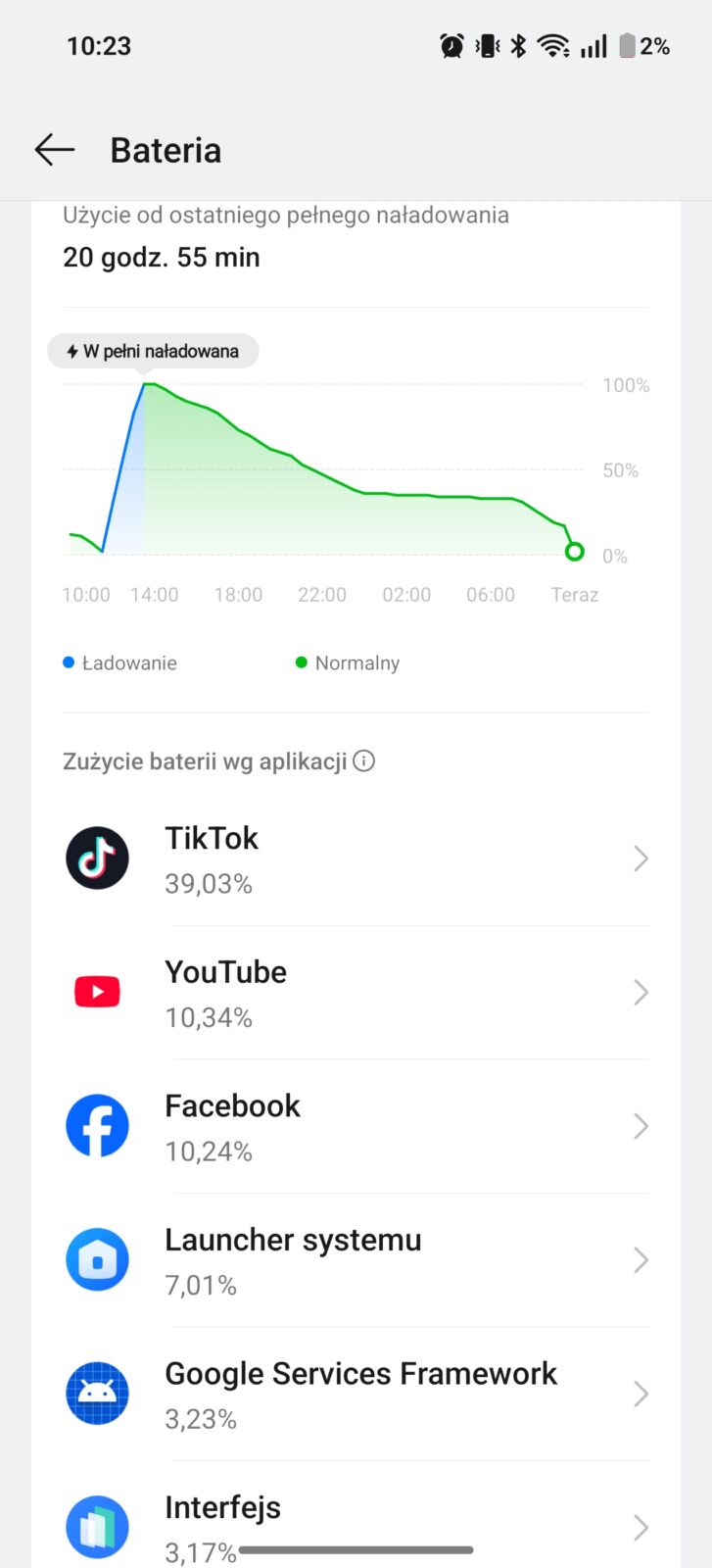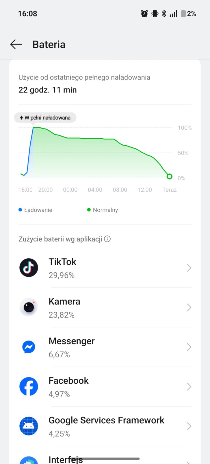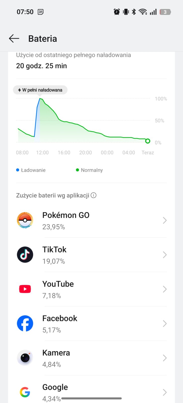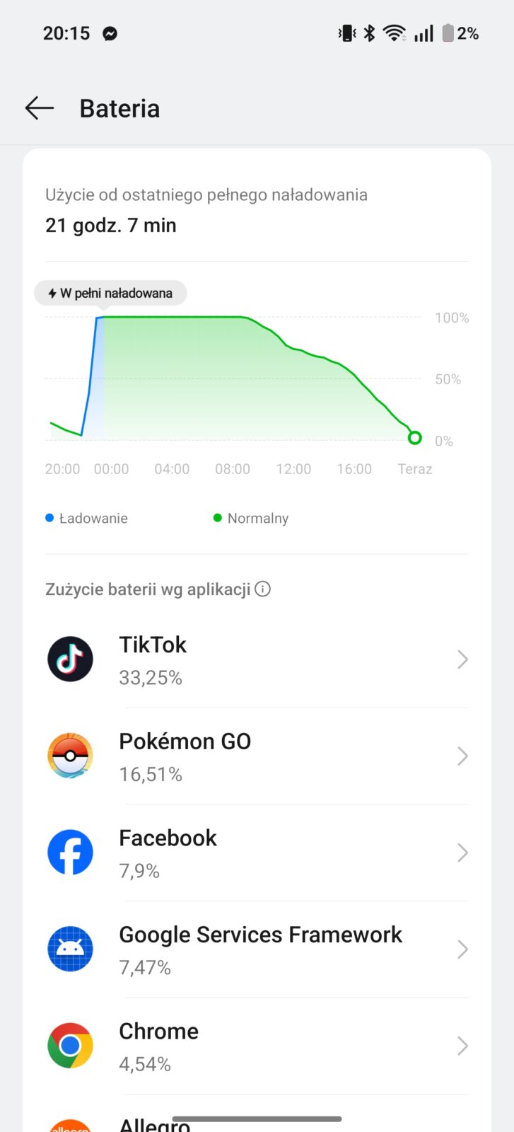 Wynik ten nie zawodzi, ale nie podejrzewam, że bateria będzie działać przez kilka lat tak samo wydajnie. Jeśli tak – super. Podczas ładowania z maksymalną mocą 80W (o 20W mniej niż w poprzedniku) SuperVOOC, ogniwo napełniało się wolniej niż w OnePlusie 13R (mimo teoretycznie kompatybilnej ładowarki). Do naładowania telefonu potrzebowałem godziny i 2 minut. Pierwszy kwadrans zapewnił naładowanie od 0 do 31%, a w pół godziny odzyskałem 53% energii. Telefonu nie naładujemy bezprzewodowo.