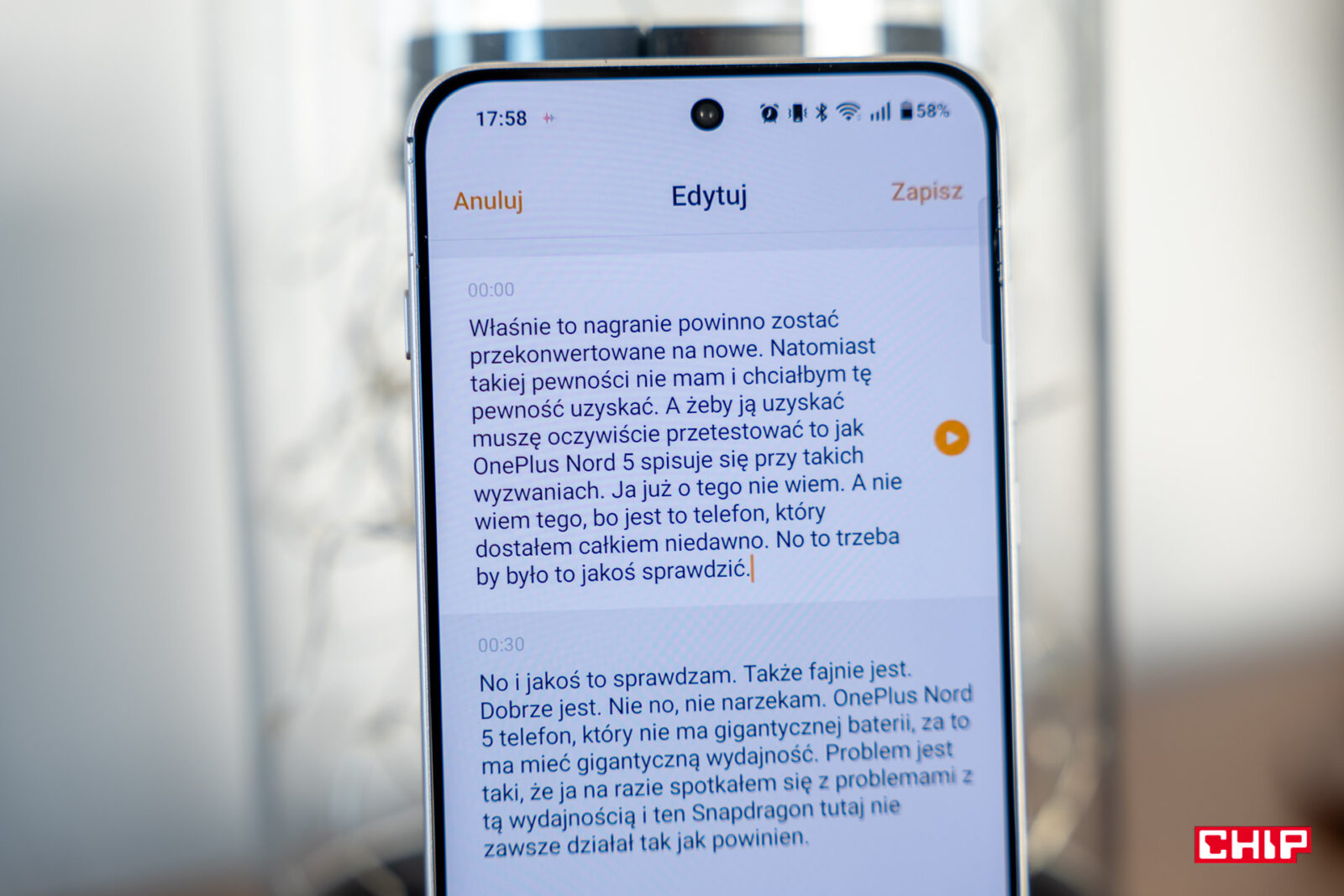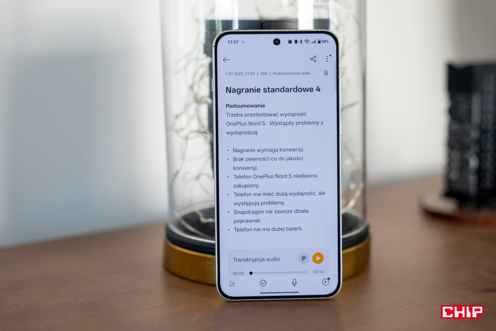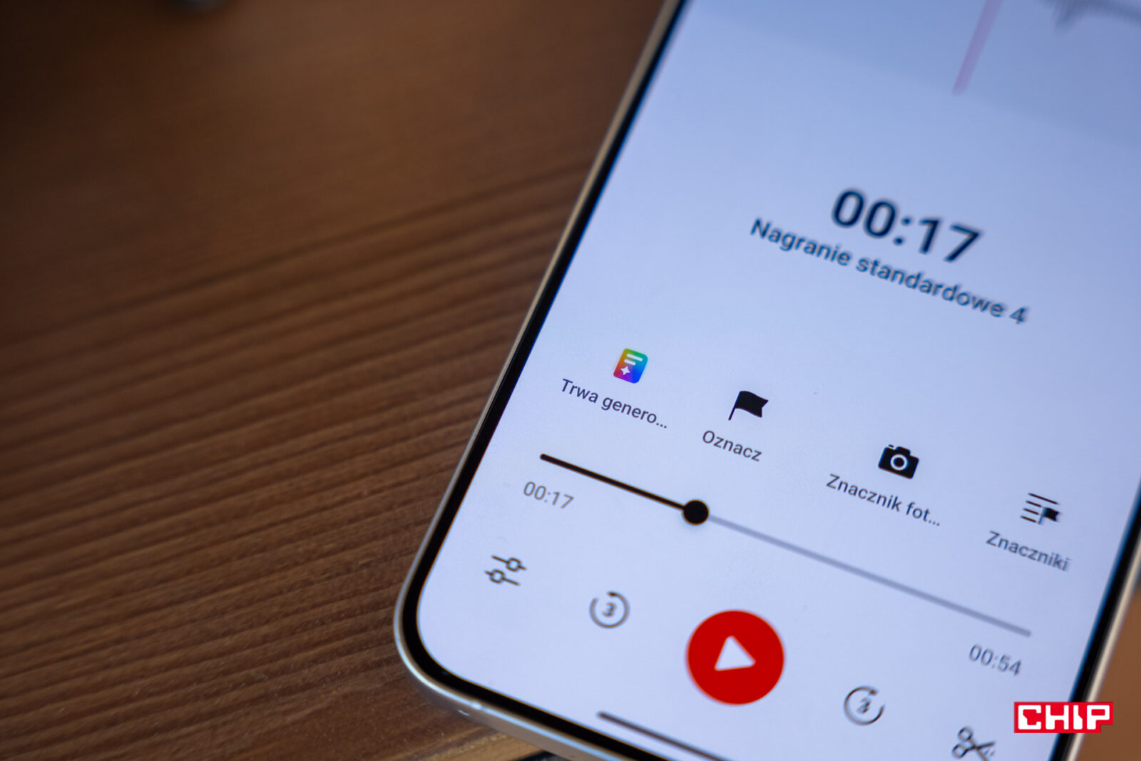 OxygenOS kontynuuje rozwój funkcji AI. W tym roku Polacy mogą cieszyć się transkrypcją i generowaniem podsumowań z nagrań w języku polskim. I piszę “cieszyć” nie na wyrost, bo rozwiązanie to osiągnęło akceptowalny poziom, jeśli chodzi o przełożenie mowy na tekst. Gorszym problemem są halucynacje i brak myślenia kontekstowego, także lepiej samodzielnie skorzystać z zapisu rozmowy (który można edytować), aniżeli liczyć na stworzenie zgrabnych notatek. Czasami przy dłuższych nagraniach program informuje o błędzie i nie potrafi wygenerować audiodeskrypcji. Resetowanie danych aplikacji pomaga.