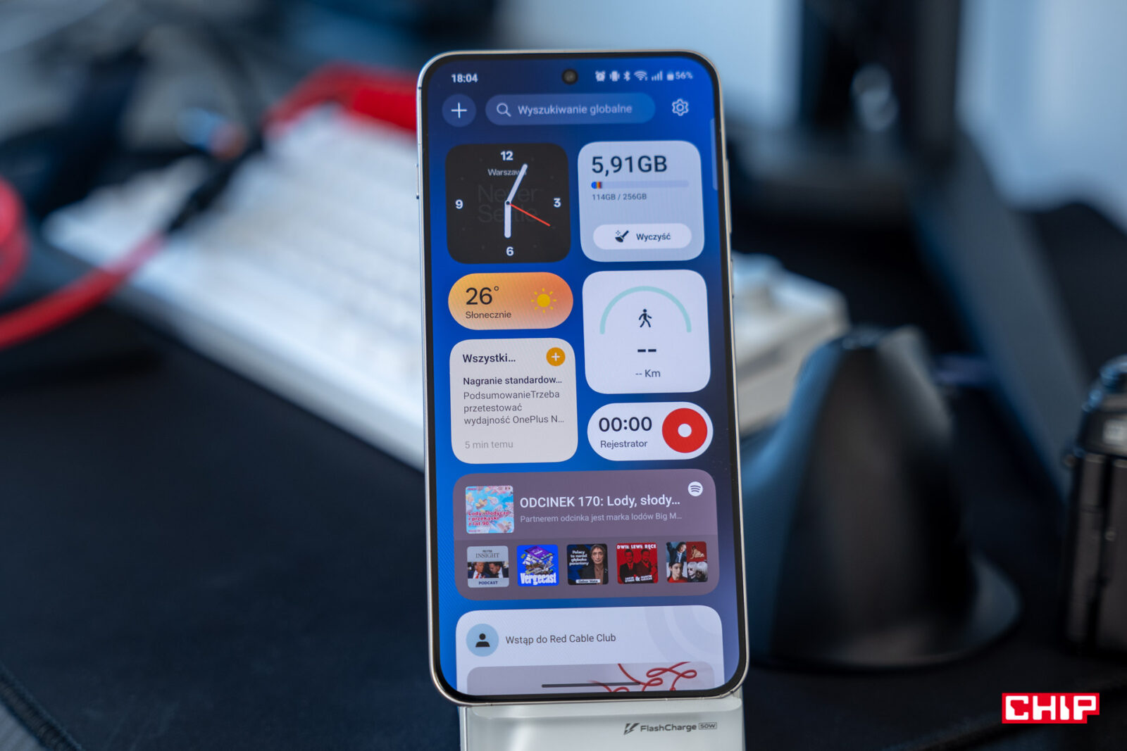 Nasz pulpit możemy złożyć z ikon, folderów w różnym rozmiarze oraz widżetów. Dodamy na nim przejścia, zmienimy ilość ikon w rzędach, a w razie czego grupowo je usuniemy lub przeniesiemy do konkretnego folderu, któremu nadamy nazwę. Pulpit w OxygenOS jest też o tyle wyjątkowy, że przeciągnięcie palcem z góry na dół może uaktywnić wyszukiwarkę aplikacji i kontaktów albo Shelf – rozwiązanie z większymi widżetami odnoszącymi się do naszych aplikacji. OnePlus Nord 5 ma zatem wiele do zaoferowania tym, którzy z pulpitu uczynią centrum dowodzenia.