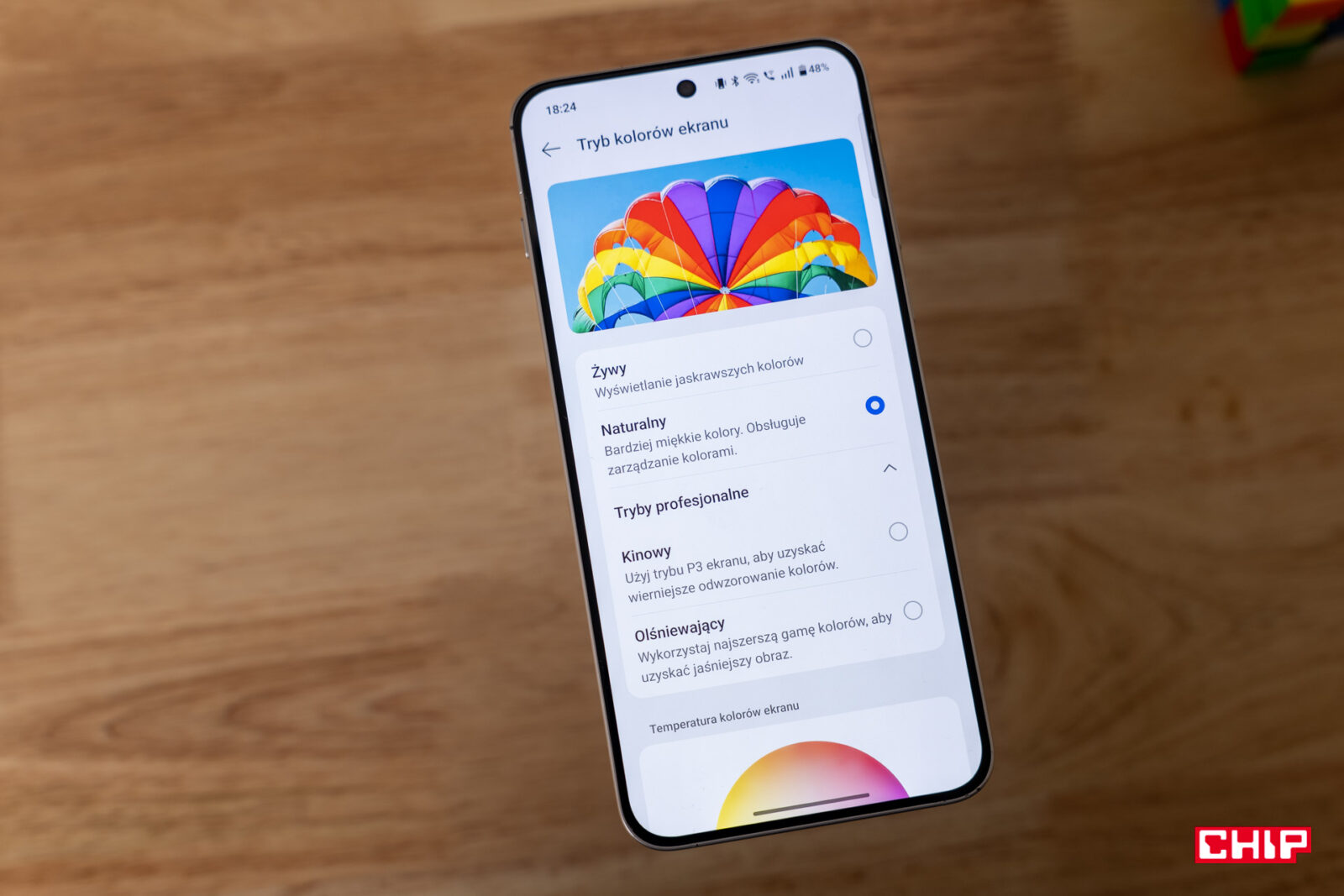 Na co dzień smartfon oferuje wiernie odwzorowane barwy lub własne podejście do ich nasycenia. W obydwu scenariuszach panel może się podobać, a producent dodatkowo daje nam ustawienia pozwalające spersonalizować wyświetlane barwy pod swoje preferencje. Kąty widzenia są tu dobre, choć czasem na biel narzuca się odrobina żółci. Jasność minimalna także jest na dobrym poziomie, choć szkoda, że nie możemy ręcznie ustawić progu, poniżej którego nie schodzi. Czernie, w związku z zastosowaną technologią AMOLED są na wzorowym poziomie.