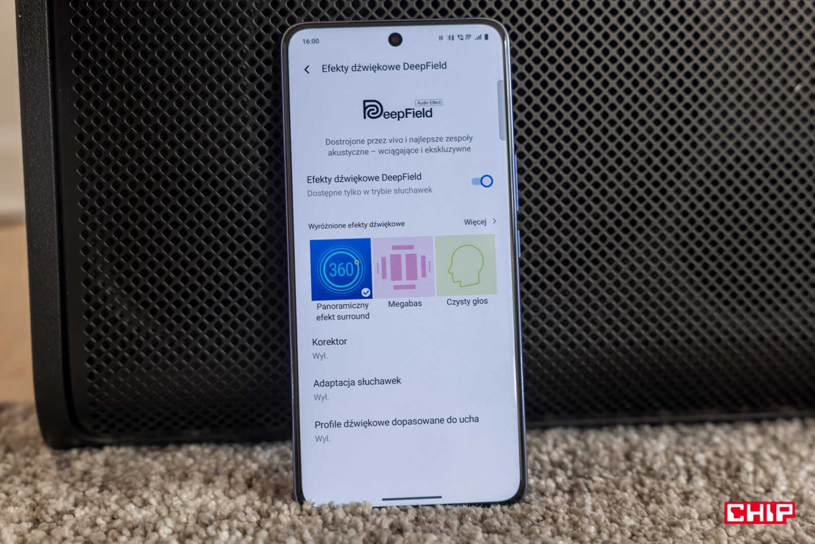 Wrażenie dźwiękowe w smartfonach, zwłaszcza w tych ze średniej półki, na przestrzeni ostatnich lat nie są szczególnie wybitne. Producenci skupiają się na tym, by dać nam oprogramowanie, które i tak niewiele zmieni, bo dźwięk nie za bardzo ma się tu z czego wydobywać. W przypadku vivo V50 postawiono na rozwiązanie DeepField, które oferuje kilka scenariuszy z gotowymi ustawieniami oraz korektor graficzny dla tych, którzy chcą wziąć sprawy w swoje ręce… ale tylko w przypadku słuchawek. Dźwięk faktycznie nieco się zmienia, choć nie nazwałbym tego rewolucją.