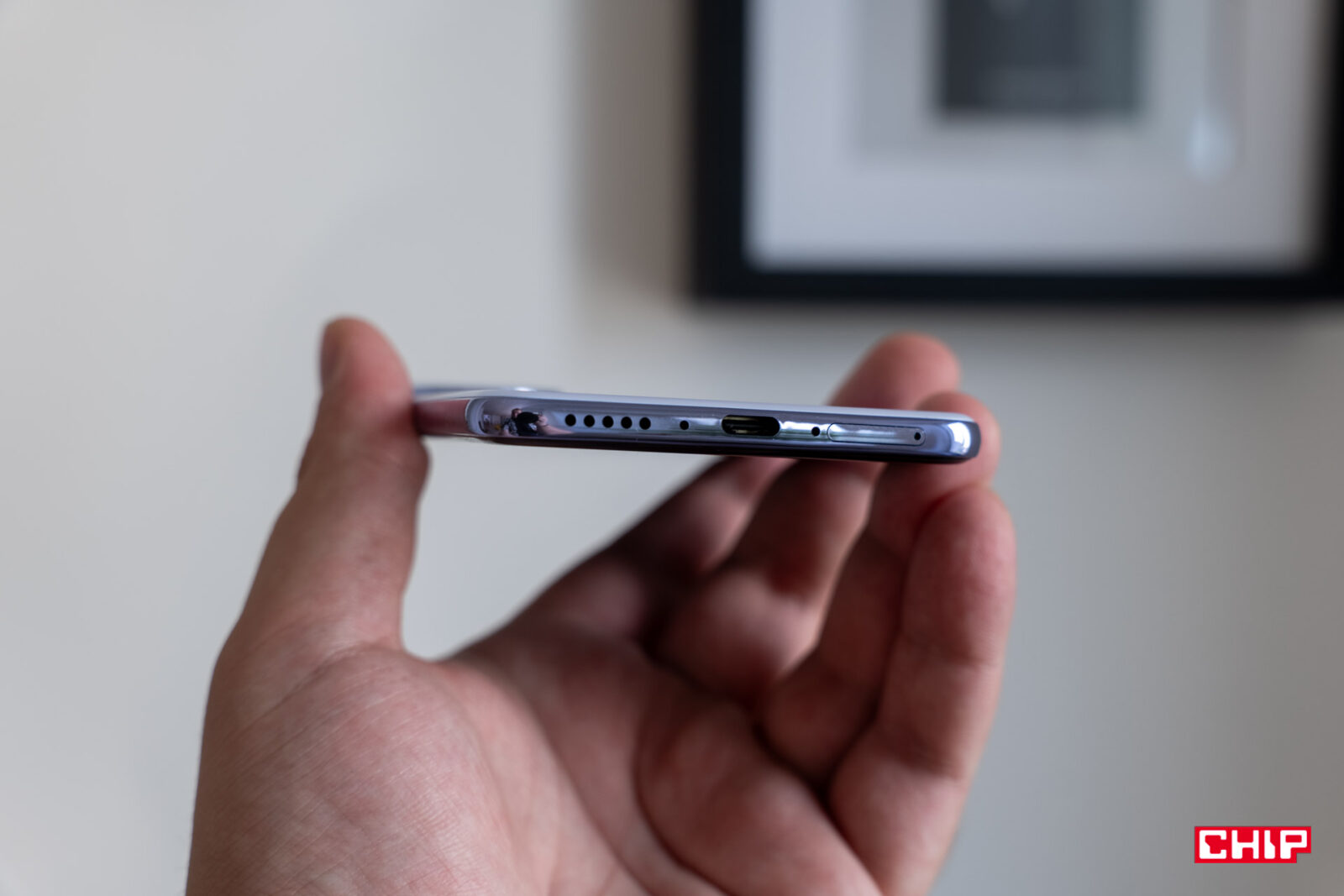 Przechodząc do dalszych elementów obudowy, dostrzeżemy, że boczne ramki wykonano z tworzywa i pomalowano błyszczącym lakierem. Chwyt urządzenia jest pewny, natomiast odporność bocznych ramek na odciski i ślady – nieduża. Producentowi udało się za to umieścić dobrze działające przyciski głośności, które nie poruszają się na boki oraz mają przyjemny klik. Nieco mniej udany jest włącznik, który nieco się chybocze, ale i tak jest solidny. Dość spodziewane jest umieszczenie portu USB-C oraz slotu na karty Nano SIM w dolnej części urządzenia, podobnie jak maskownicy głośnika. Na górnej krawędzi znajduje się wyłącznie otwór wlotowy dla mikrofonu.