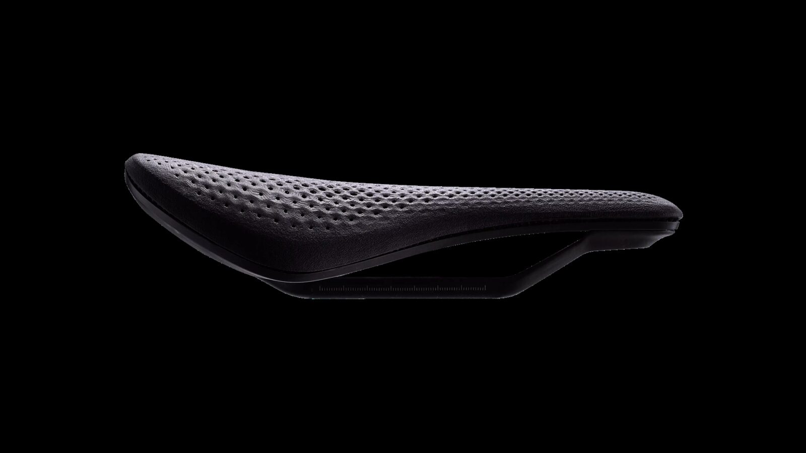 Specialized S-Works Power EVO Mirror to nie byle pianka obita tworzywem sztucznym. Nowy model wykorzystuje strukturę plastra miodu, która to jest drukowana w 3D z ciekłego polimeru w 40% pochodzenia bio. W efekcie łącznie aż 47000 “strun” i 21000 węzłów tworzy zróżnicowaną gęstość podparcia na całej powierzchni siedziska o materiałowej fakturze, a to akurat coś, czemu pianka nie jest i nigdy nie będzie w stanie dorównać. Efekt jest nie tylko teoretyczny, bo badania firmy wykazały znaczące zmniejszenie nacisku o nawet 34,1% na samym przodzie siodełka, a testy “w ciemno” miały potwierdzić, że to najbardziej wygodne siodełko w swojej klasie.
