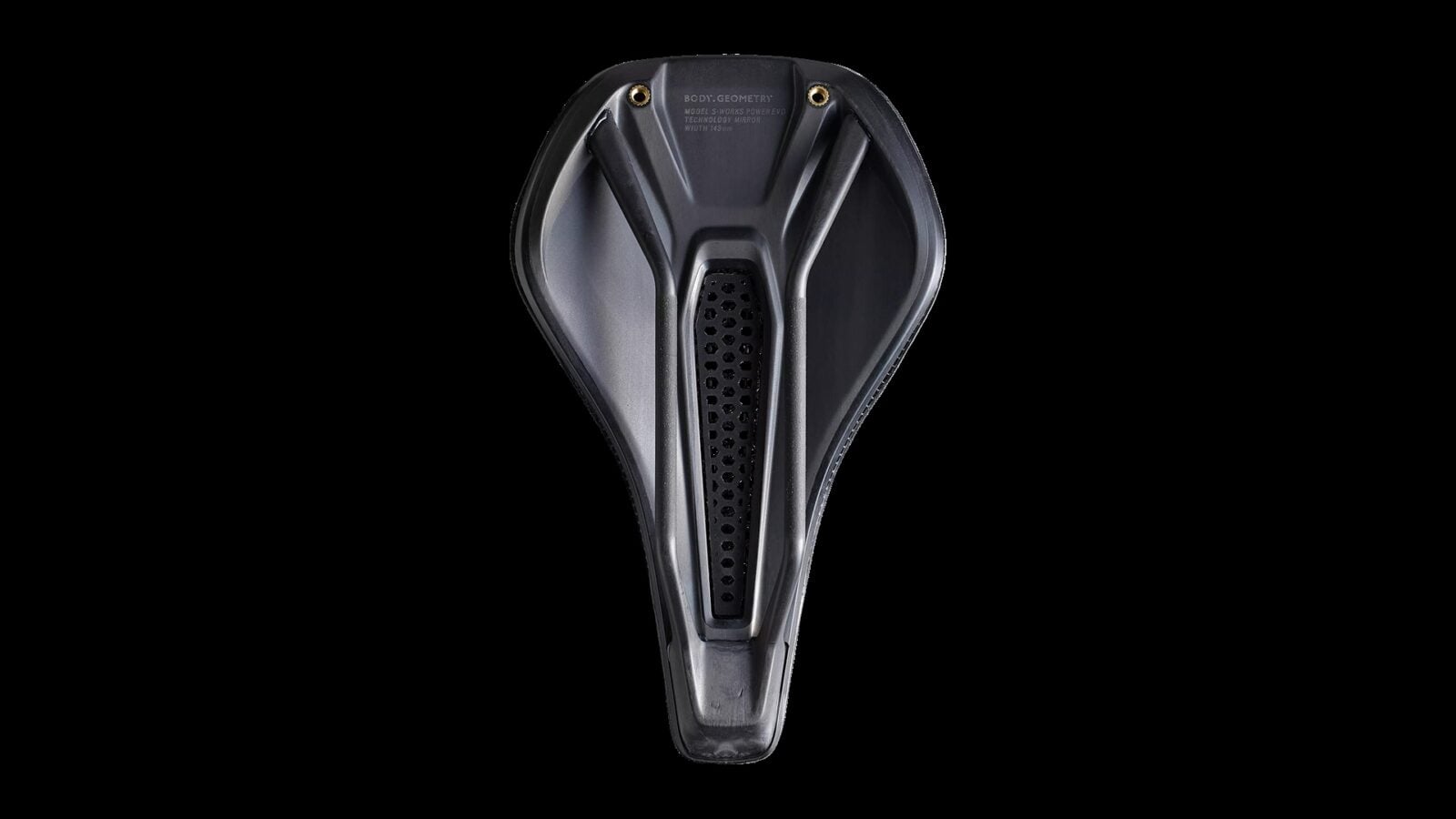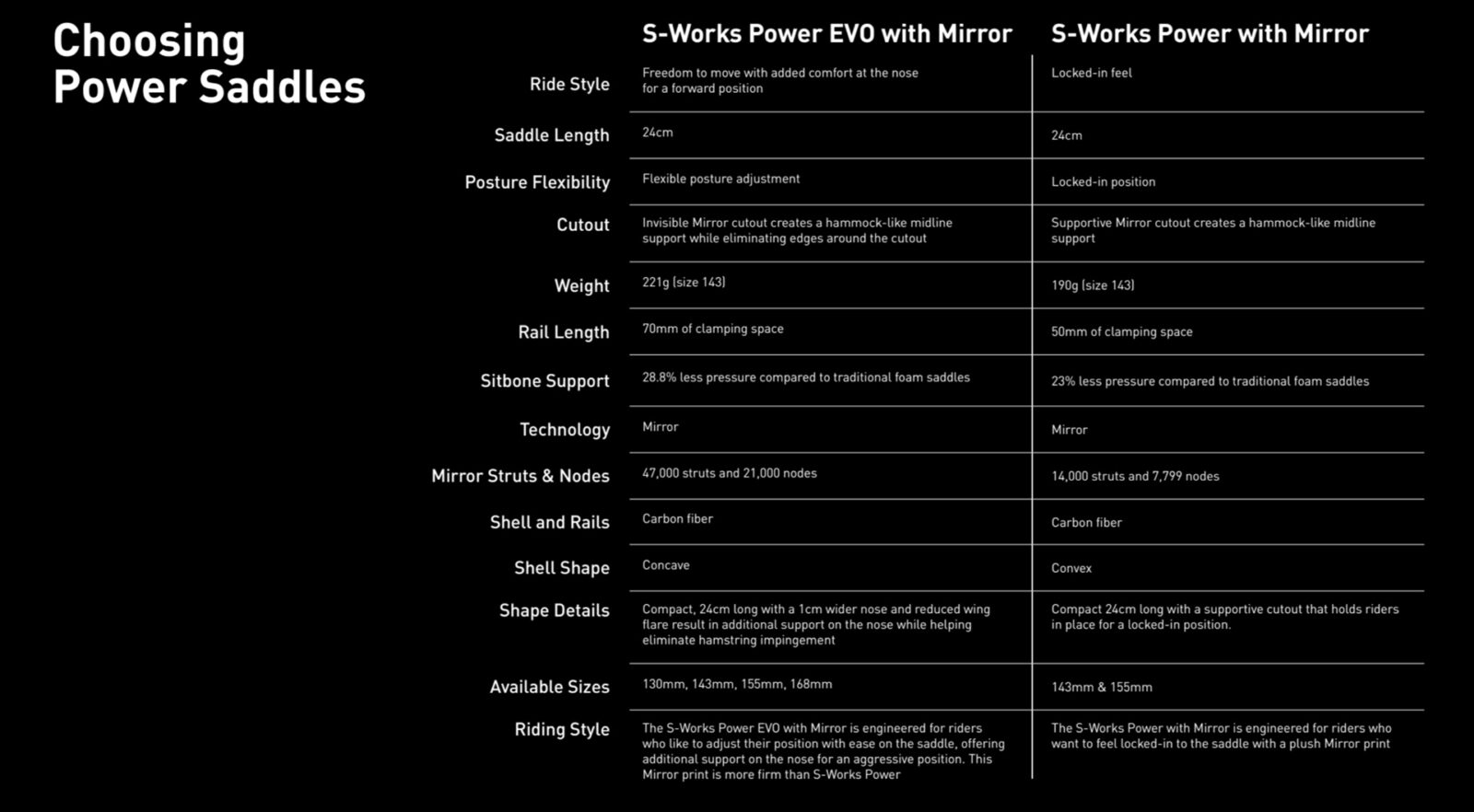 Mimo że długość ulepszonego modelu S-Works Power Mirror wynosi wciąż 24 cm, to siodełko zyskało szerszy przód (+1 cm) i wydłużone o 2 cm szyny z włókna węglowego (teraz 70 mm), co nie jest przypadkiem, a ma pozwalać na bardziej agresywną pozycję i przesuwanie się do przodu podczas jazdy. Idąc dalej, niewidoczny wycięty kanał wzdłuż osi siodełka ma poprawiać rozkład nacisku bez ostrych krawędzi, podczas gdy delikatnie rozszerzone skrzydła poprawiają pracę ud, eliminując ucisk na ścięgna.