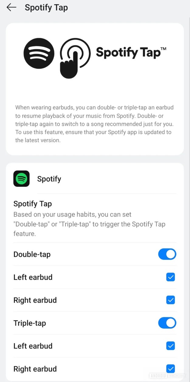 Zgodnie z opisem, który widzicie na zrzucie ekranu, będzie można ustawić podwójne lub potrójne dotknięcie dowolnej słuchawki, aby wznowić odtwarzanie muzyki ze Spotify na podłączonym telefonie. Powtórzenie gestu pozwoli na przełączenie się do rekomendowanej piosenki. Warto jednak pamiętać, że obecne opcje konfiguracji w testowej wersji są nieco zagmatwane, co sugeruje, że ich układ i funkcjonalność zostaną dopracowane przed oficjalnym wdrożeniem dla użytkowników. Na razie funkcja jest wciąż rozwijana, więc jej działanie może się nieco różnić od tego, co zobaczymy w stabilnej wersji.