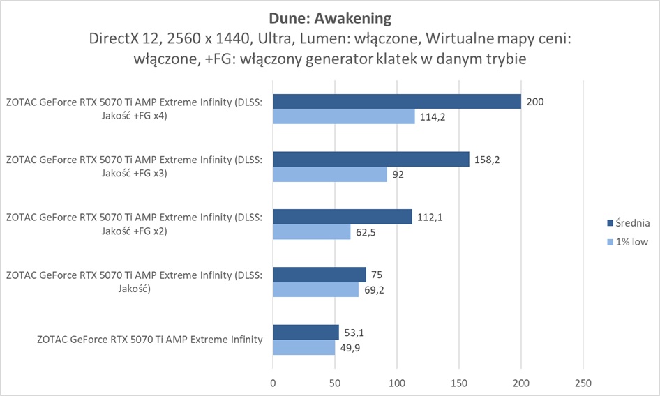 W drugiej z gier ponownie widać zyski z technologii Nvidia. Sam DLSS: Jakość zapewnia już w pełni płynną rozgrywkę. Dołożenie generatora klatek x2 znacznie podnosi średnią, choć minimalnie spada 1% low. Warto zwrócić też uwagę na wyniki z generatorem klatek x4 – średnia wynik wynosi ok. 376% początkowego.