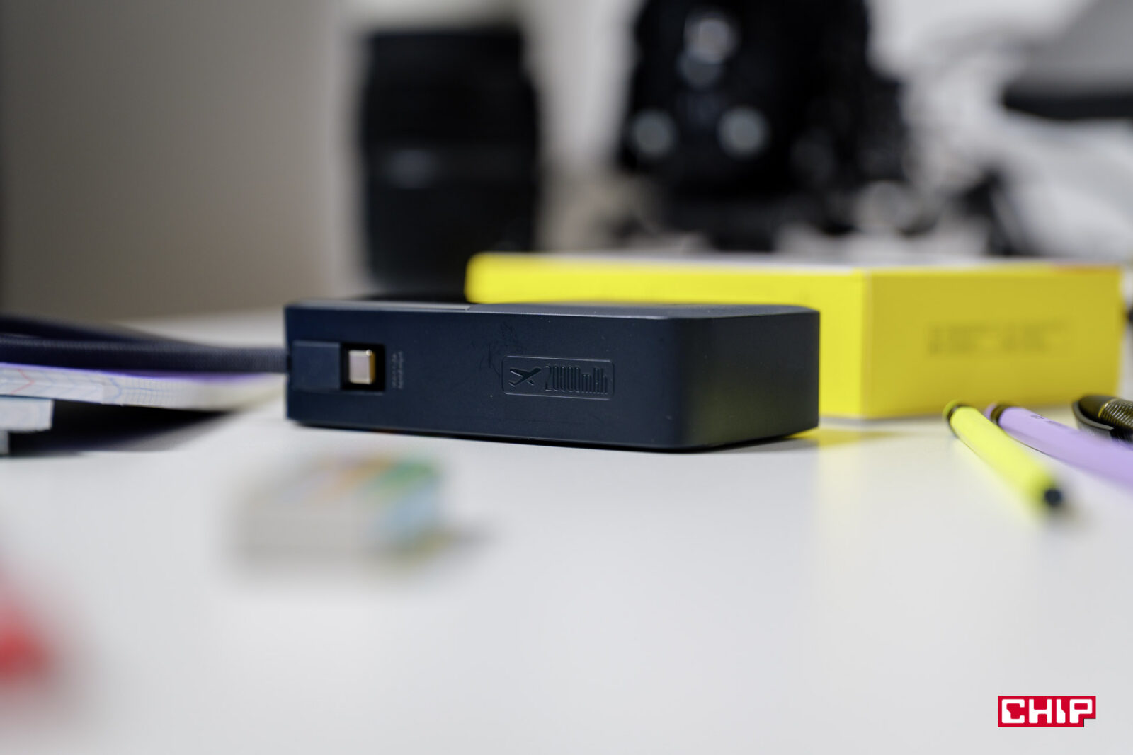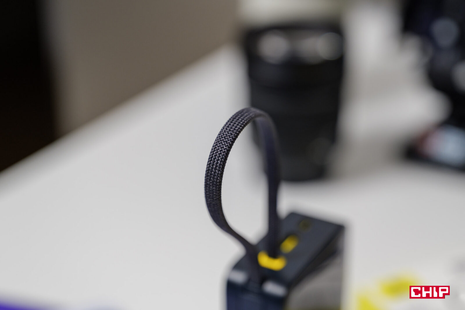 Szczególną uwagę zwraca wbudowany, pleciony kabel USB-C o długości 22 cm. Jest on nie tylko praktyczny, eliminując potrzebę noszenia dodatkowego przewodu, ale też wytrzymały — producent deklaruje, że przeszedł testy ponad 10 tysięcy zgięć bez utraty funkcjonalności. Kabel może pełnić rolę zawieszki, co jest ciekawym rozwiązaniem podczas wędrówek czy podróży — a w górach czy miejskiej dżungli faktycznie może się to przydać. Zazwyczaj średnio ufam tego typu rozwiązaniom, ale tutaj po podskakiwaniu z plecakiem czy ruszaniem nim przesadnie energicznie powerbank cały czas się trzymał, więc dzięki systemowi blokady końcówki kabla, raczej można temu zaufać.
