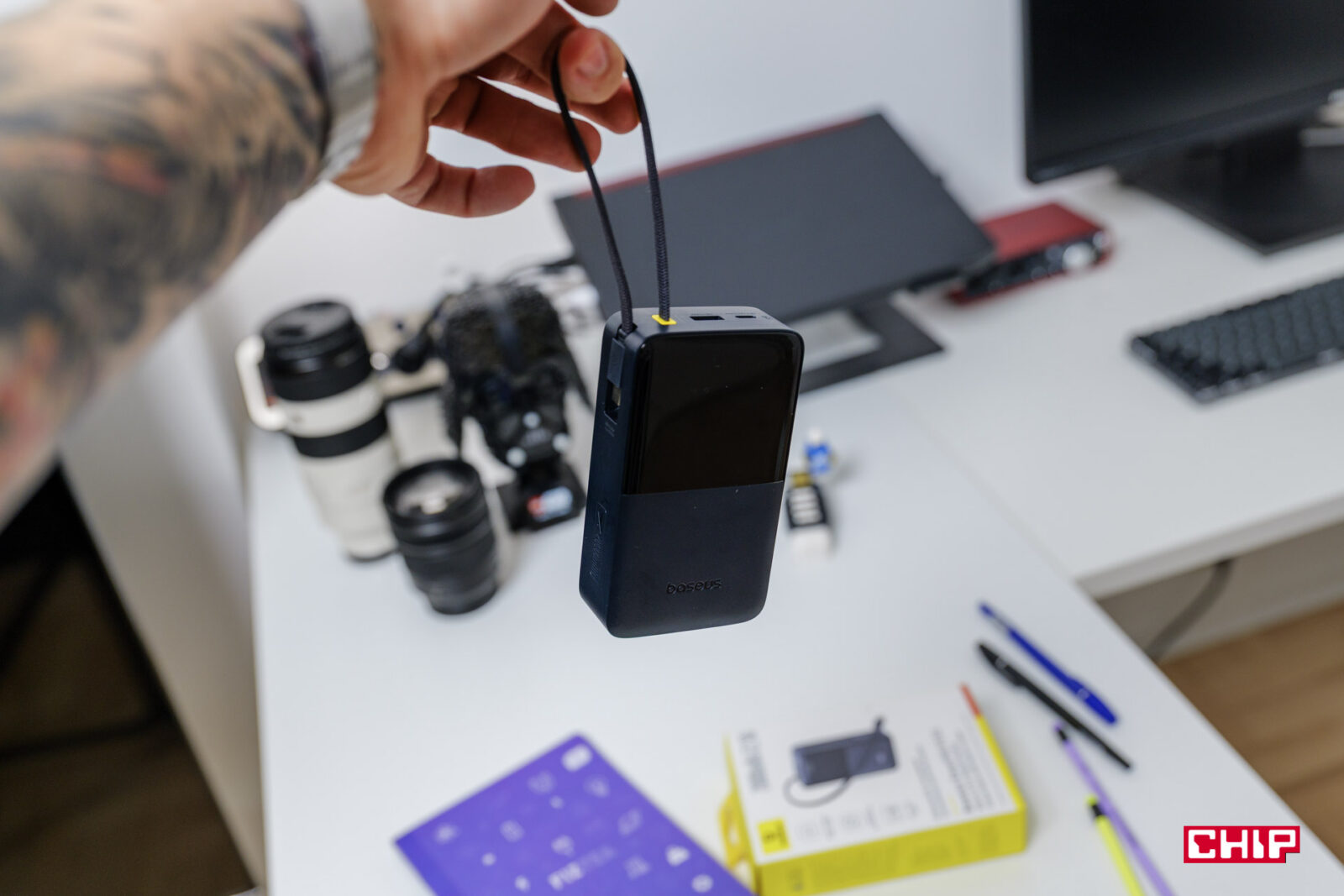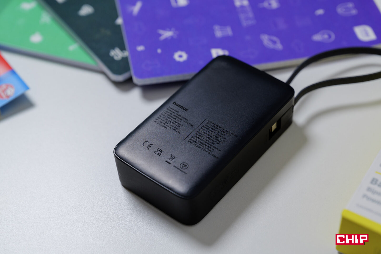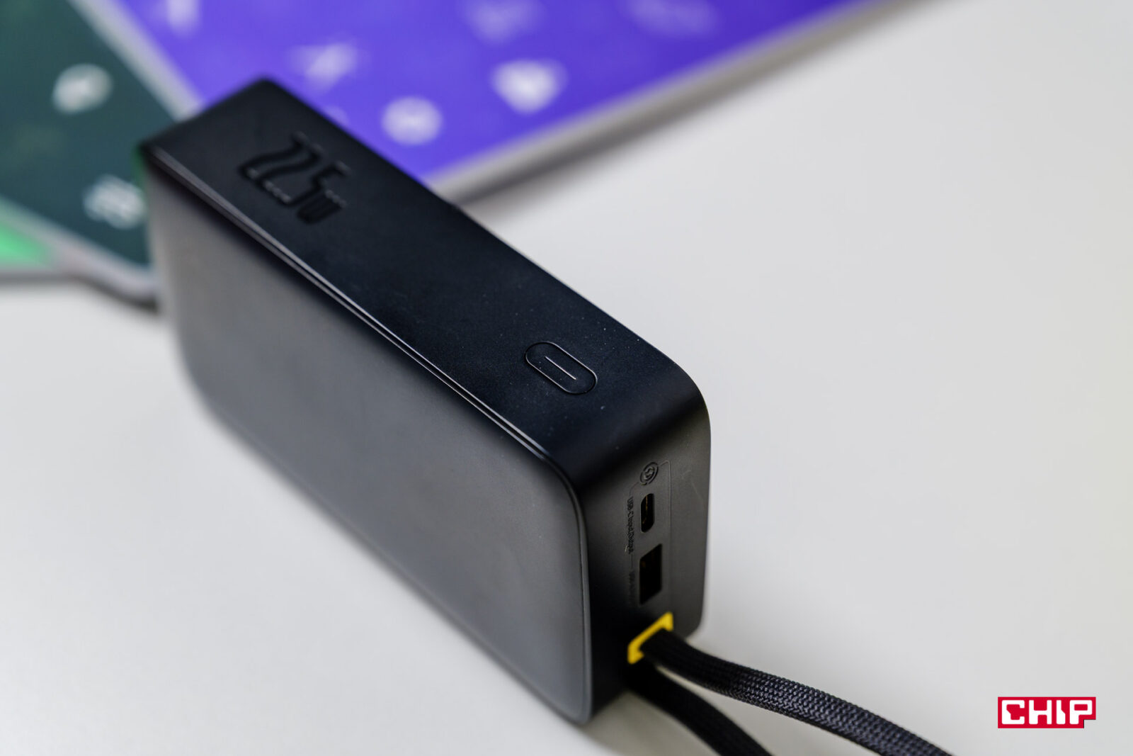 Z przodu urządzenia mamy w dolnej części logo Baseusa, a górną połowę zajmuje wspomniana śliska powierzchnia z wyświetlaczem. Prawy bok to włącznik oraz nadrukowane (w kolorze urządzenia, co ważne) 22.5 W, co oczywiście informuje o prędkości ładowania. Z tyłu, na matowym wykończeniu, znajdziemy wszystkie emblematy i niezbędne informacje (również w takim kolorze, żeby były mało widoczne i nie paskudziły nam powerbanku), a na lewej krawędzi mamy pojemność powerbanku, ikonę samolotu, która oznacza, że spokojnie można latać z tym powerbankiem, i końcówkę wbudowanego kabla USB-C. Dolna krawędź jest pusta, za to na górze mamy wychodzący pleciony przewód oraz gniazda USB-A i USB-C — i to właśnie tutaj są skromne, żółte akcenty. Jest więc standardowo, ale schludnie i praktycznie; nie ma się do czego przyczepić.