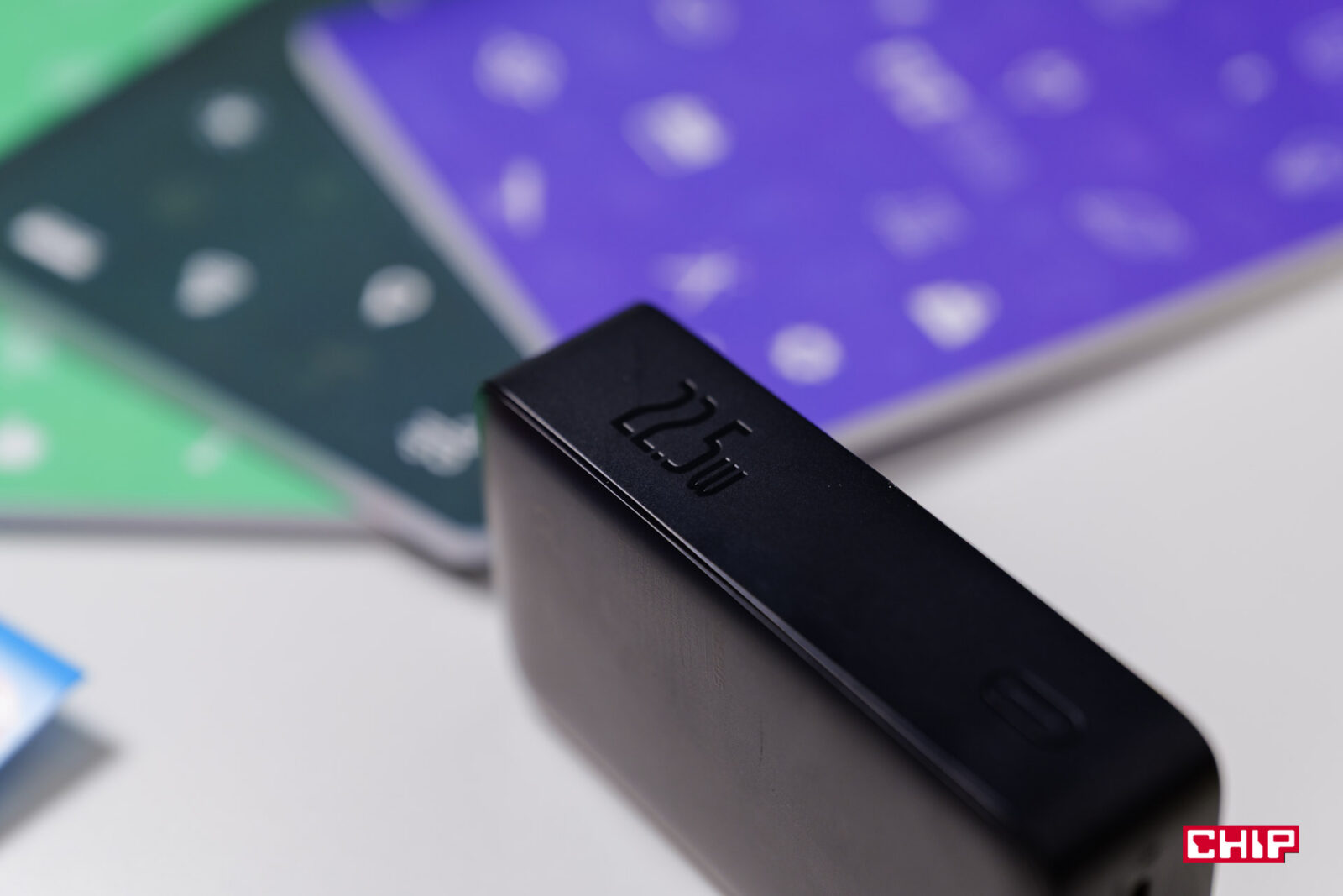 Baseus Bipow 2 Pro z wyglądu to dość standardowy powerbank. Czarna, matowa obudowa wykonana z tworzywa sztucznego (ABS i poliwęglanu) ze skromnymi żółtymi wstawkami jest przyjemna w dotyku i odporna na codzienne zużycie. Nieco gorzej ma się to w przypadku połowy przedniej części urządzenia, która jest śliska, a w konsekwencji palcuje i rysuje się od samego patrzenia. Pod nią ukryty jest również mały, najprostszy cyfrowy wyświetlacz LED, który pokazuje stan naładowania powerbanku oraz może pokazywać informacje o ładowaniu urządzeń.