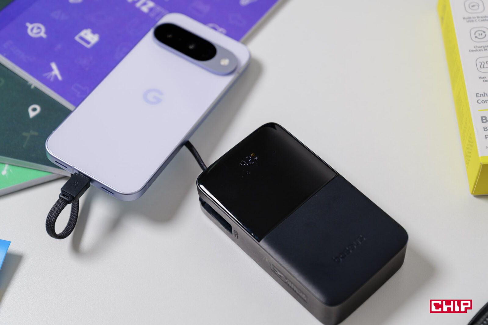 Powerbank obsługuje ładowanie o maksymalnej mocy 22,5 W, wspierając standardy Power Delivery (PD), Quick Charge 3.0 (QC), Samsung AFC oraz Huawei SCP. Jeśli macie więc smartfony, które wspierają faktycznie szybkie ładowanie, to nie będzie to demon prędkości — ale posiadacze iPhone’ów czy Samsungów nie będą mieli na co narzekać. W testach urządzenie sprawnie ładowało zarówno urządzenia Apple, jak i Androidy (pod powerbanka podpinałem także Samsunga Galaxy S25 Plus i Google Pixel 10 Pro). Trzeba jednak mieć na uwadze, że w przypadku bardziej wymagających sprzętów, takich jak niektóre laptopy, moc 22,5 W może okazać się niewystarczająca do pełnego ładowania — sprawdzi się raczej w trybie awaryjnym. Ładowanie samego powerbanku przez port USB-C trwa około 3–4 godziny przy użyciu kompatybilnej ładowarki sieciowej, co jest niezłym wynikiem w tej klasie.