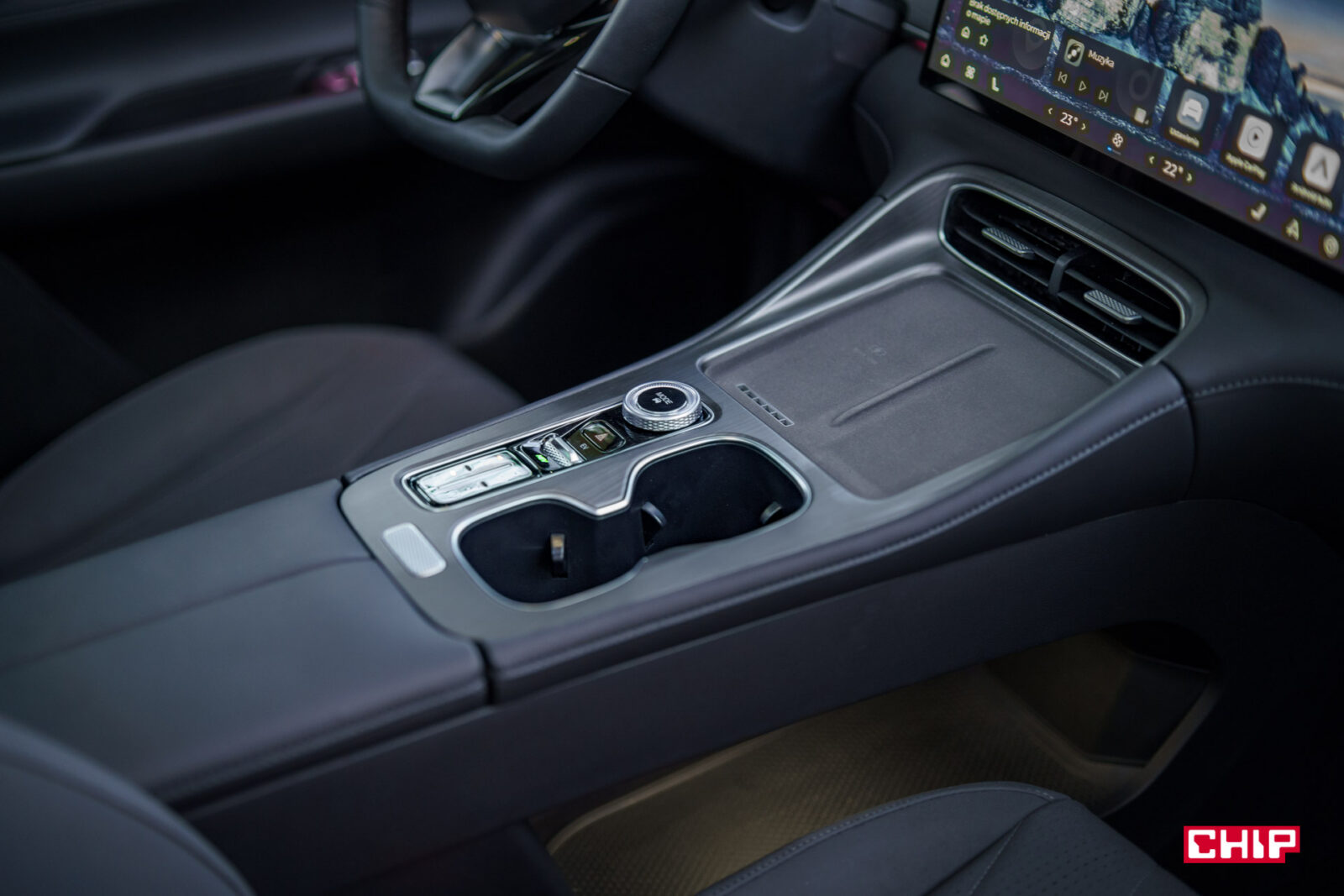 Do dyspozycji mamy dwie ładowarki indukcyjne na konsoli środkowej. Fajnie, że o mocy aż 50 W i chłodzone. Do tego mieszczą nawet największe dostępne na rynku smartfonu, tylko umieszczenie tego elementu mogło być lepsze. Jadąc w słońcu ekrany leżących tam smartfonów nieprzyjemnie odbijają światło.