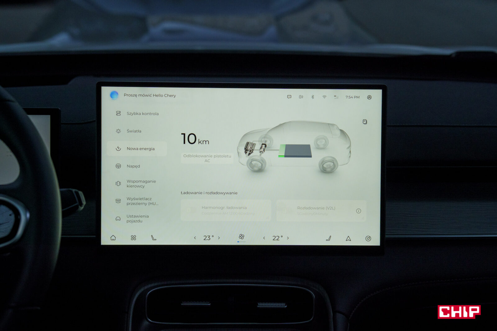 Czy korzystanie z ładowarek DC w hybrydach typu Plug-In ma sens? To zależy. W normalnych okolicznościach powiedziałabym, że niekoniecznie, bo ładowanie DC jest znacznie droższe, niż korzystanie z gniazdka w garażu, ale Chery Tiggo 8 PHEV jest wyposażone w funkcję V2L (Vehicle-to-Load), co oznacza, że mógłby zasilać nawet dom. Co prawda nasze krajowe przepisy nie przewidują jeszcze tej możliwości, ale jeżeli na przykład jedziecie na biwak i potrzebujecie źródła prądu – voila! Wystarczy podłączyć sprzęt elektroniczny do samochodu i będzie z niego korzystał jak z power banka z maksymalną mocą zasilania 3,3 kW. Więc kochani, jeżeli wyjedziecie w jakąś głuszę, dodatkowo zabierzecie jakąś przyczepę kempingową, wystarczy podłączyć ją pod auto. Zabrakło prądu? Wystarczy wyskoczyć do najbliższej ładowarki DC, w niecałą godzinkę naładować baterię i znowu macie prąd. Użyteczne.
