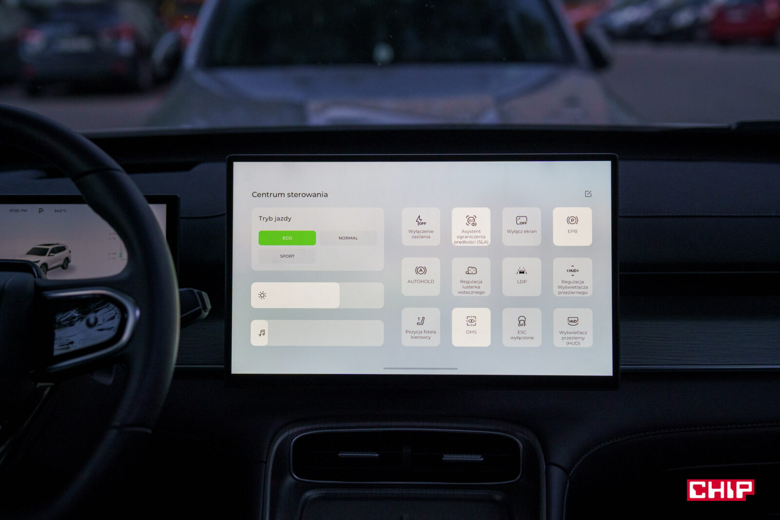 Poza tym sam interfejs jest bardzo przyjazny w obsłudze. Wszystkie opcje są logicznie pogrupowane i łatwe do odnalezienia. Ściągając ekran z góry mamy dostęp do Centrum Sterowania, gdzie możemy ustawić skróty do najczęściej wybieranych opcji. Tutaj też domyślnie znajdziemy wyłączenie najbardziej irytujące systemy bezpieczeństwa, jak monitorowanie prędkości i uwagi kierowcy.