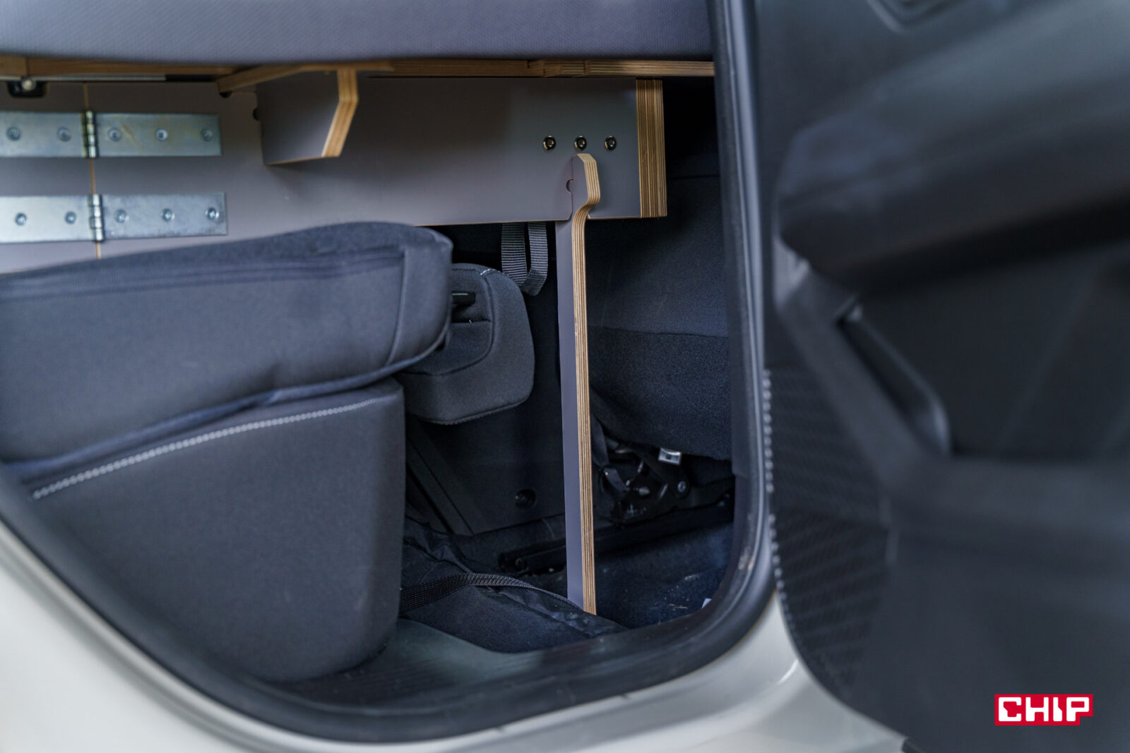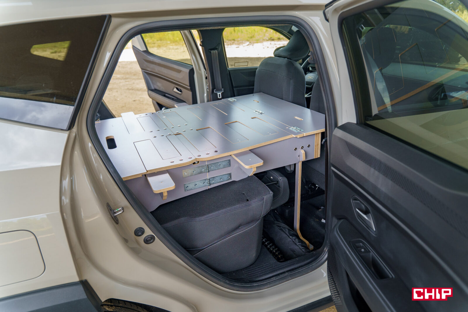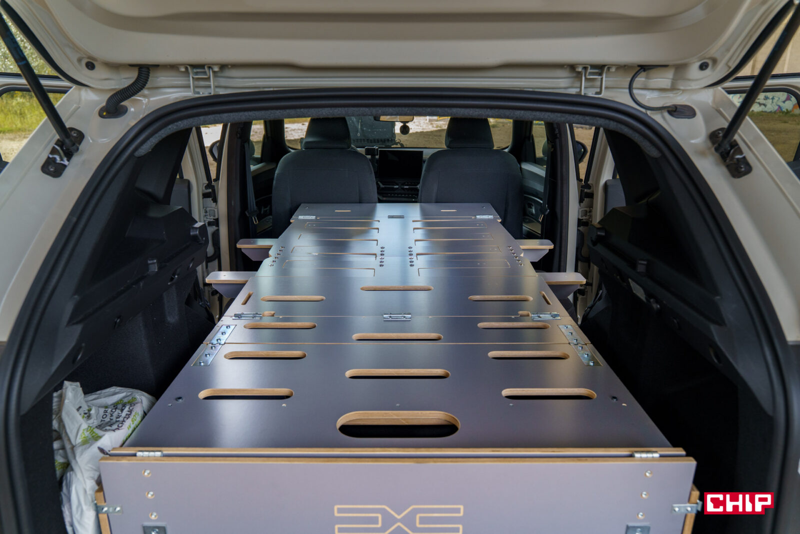 Testowany egzemplarz był w wariancie ze Sleep Packiem. Oznacza to, że bagażniku była skrzynia, którą (teoretycznie) w mniej niż 2 minuty można przekształcić w pełnowymiarowe łóżko, nawet dla dwóch osób — jego wymiary to 190 cm x 130 cm. Całość waży 50 kg, co naturalnie zmniejsza ładowność do około 440 kg, ale przede wszystkim zajmuje absolutnie cały bagażnik. Fakt, do środka skrzyni da się wrzucić jakieś pojedyncze zakupy czy mniejsze torby, ale walizka się tam raczej nie zmieści — a i za każdym razem przy wkładaniu lub wyjmowaniu czegokolwiek ze skrzyni, musimy walczyć z naprawdę ciężką pokrywą. W takim wypadku bagaże muszą iść na tylną kanapę i przy nieco dłuższych wypadach może to być problematyczne.