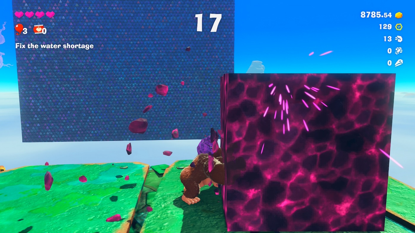Mianowicie, jest tu mnóstwo zabawy z otoczeniem. Czasem musimy rozwalić wysoki głaz, który rzuca cień na kwiatek, uniemożliwiając mu właściwe kwitnięcie — wtedy więc interwencja pięści goryla okazuje się zbawienna. Innym razem musimy wyrwać kawałek kamiennej podłogi, żeby utorować sobie drogę przez kolczaste bluszcze, jeszcze w innym miejscu na wyrwanym kawałku głazu możemy surfować po okolicy, a w innych sytuacjach rzucanie błotem czy ziemią pozwoli nam zbudować krzywy mostek, który jednak pozwoli nam dotrzeć do znajdźki.