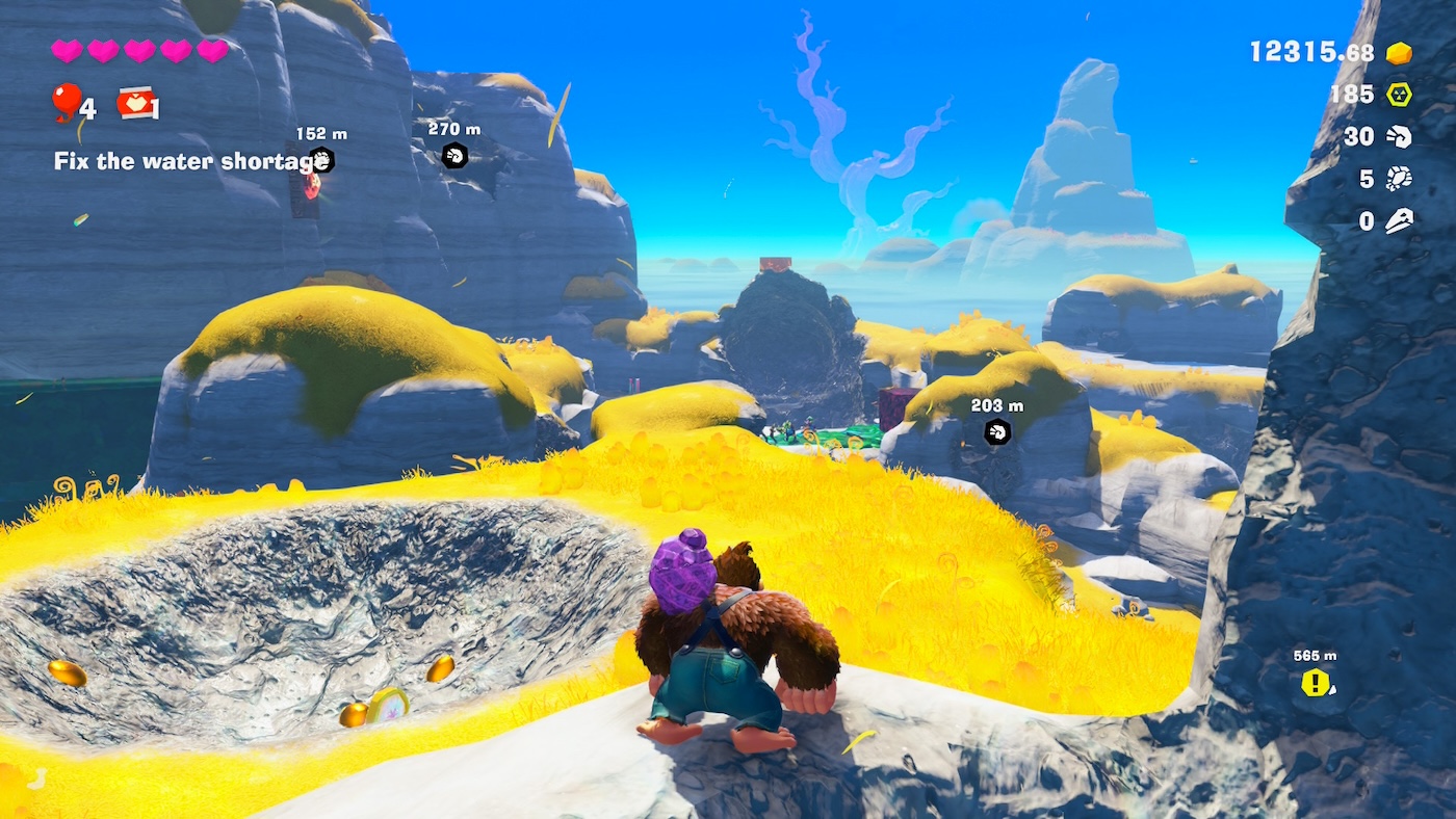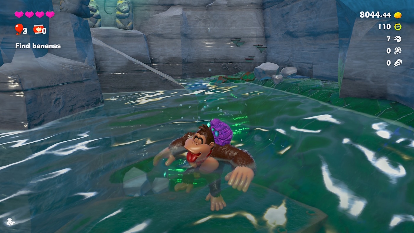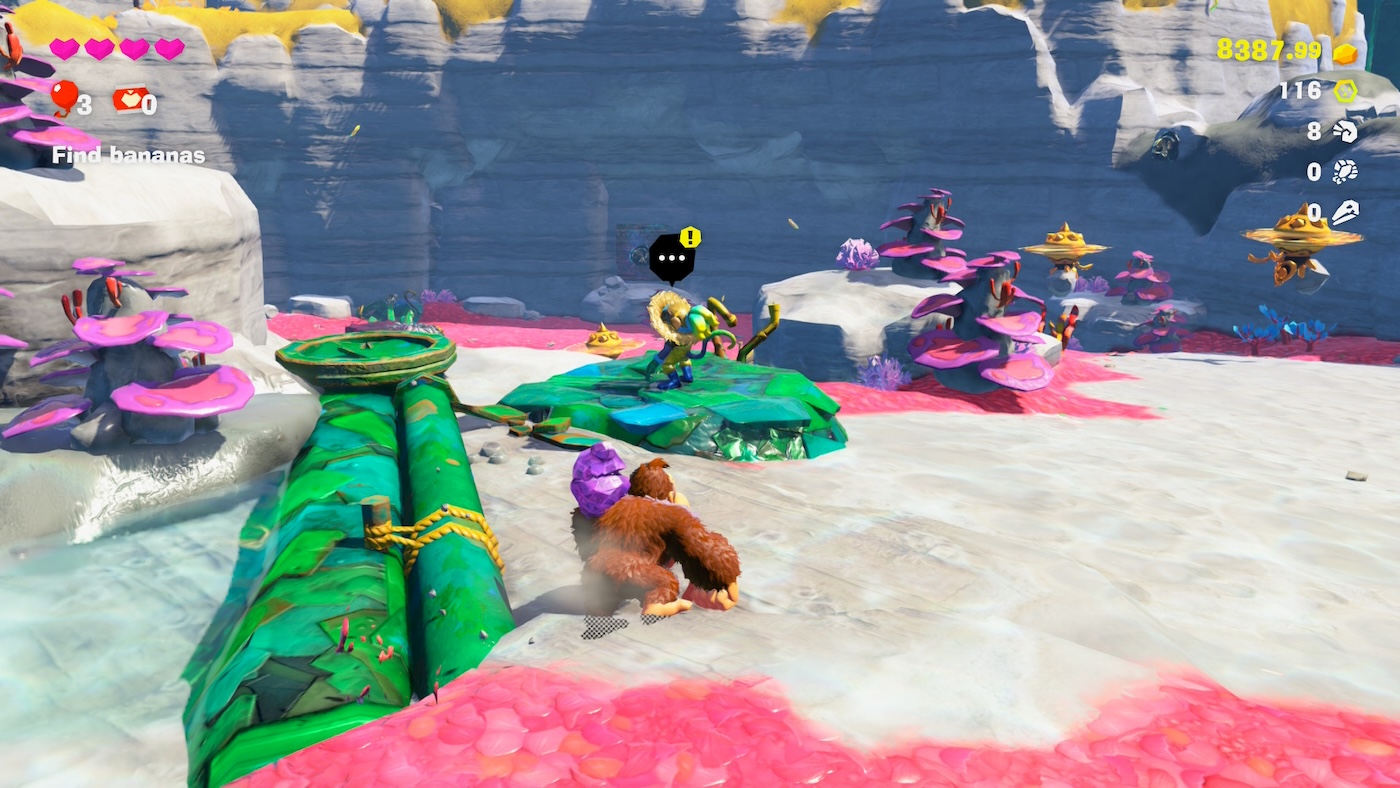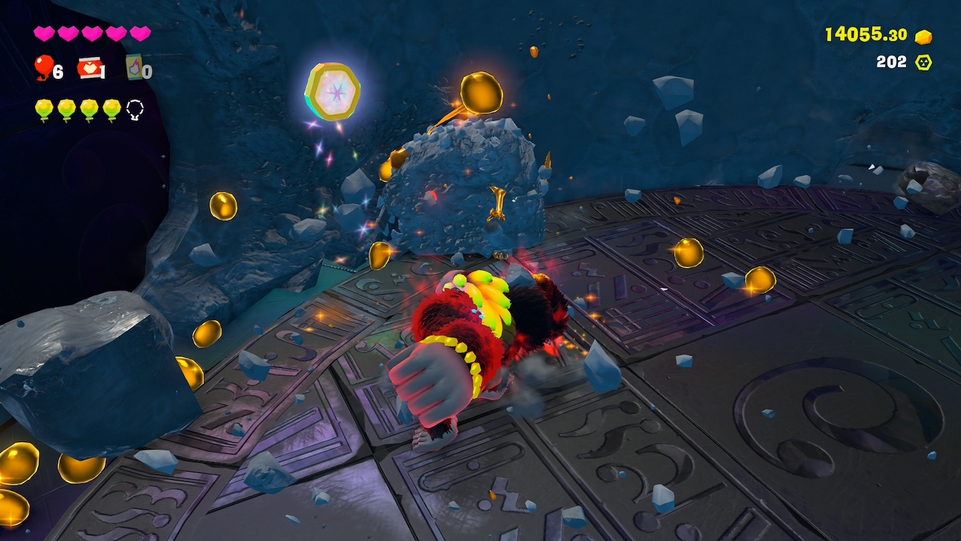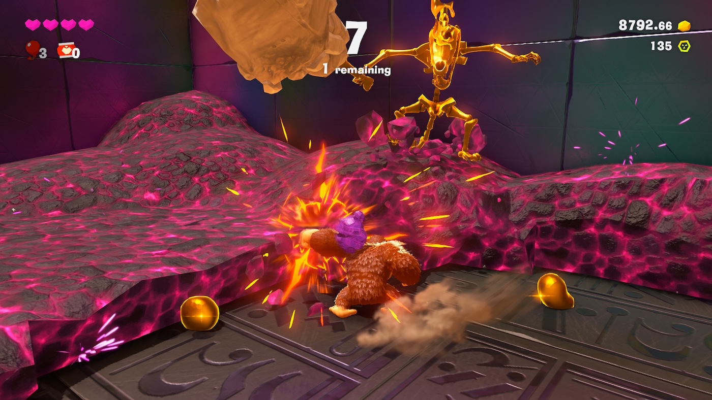 Każdy biom to również unikalna mechanika. Na lodzie się ślizgamy, wulkaniczne poziomy zmuszają do omijania lawy, dżungle zachęcają do wspinaczki po lianach i unikania drapieżnej roślinności. Połączono tu klasyczne sekcje 2D z eksploracją sandboksowych przestrzeni, a platformowe zagadki korzystają z inspiracji takimi grami jak Zelda czy Splatoon, zapewniając nieustannie coś nowego do odkrycia. Poza zbieraniem bananów na mapie, mamy także do dyspozycji dodatkowe poziomy w formie wyzwań, które są równie kreatywne i pozwalają zmienić nieco percepcję na rozgrywkę.