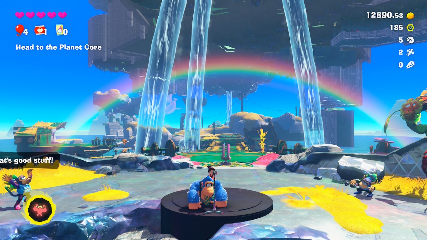 Podziemne królestwa Bananza to prawdziwa rewia bogactwa. Od zielonych dżungli, przez rwące strumienie lawy i ośnieżone groty, po fantazyjne i nieco futurystyczne miejscówki. Każdy poziom zachęca do eksploracji i kreatywnej destrukcji, a projektanci zadbali, by znajdźki faktycznie nagradzały ciekawość zamiast zwyczajnie zalewać gracza morzem przedmiotów — balans pod tym względem jest świetnie wyważony.
