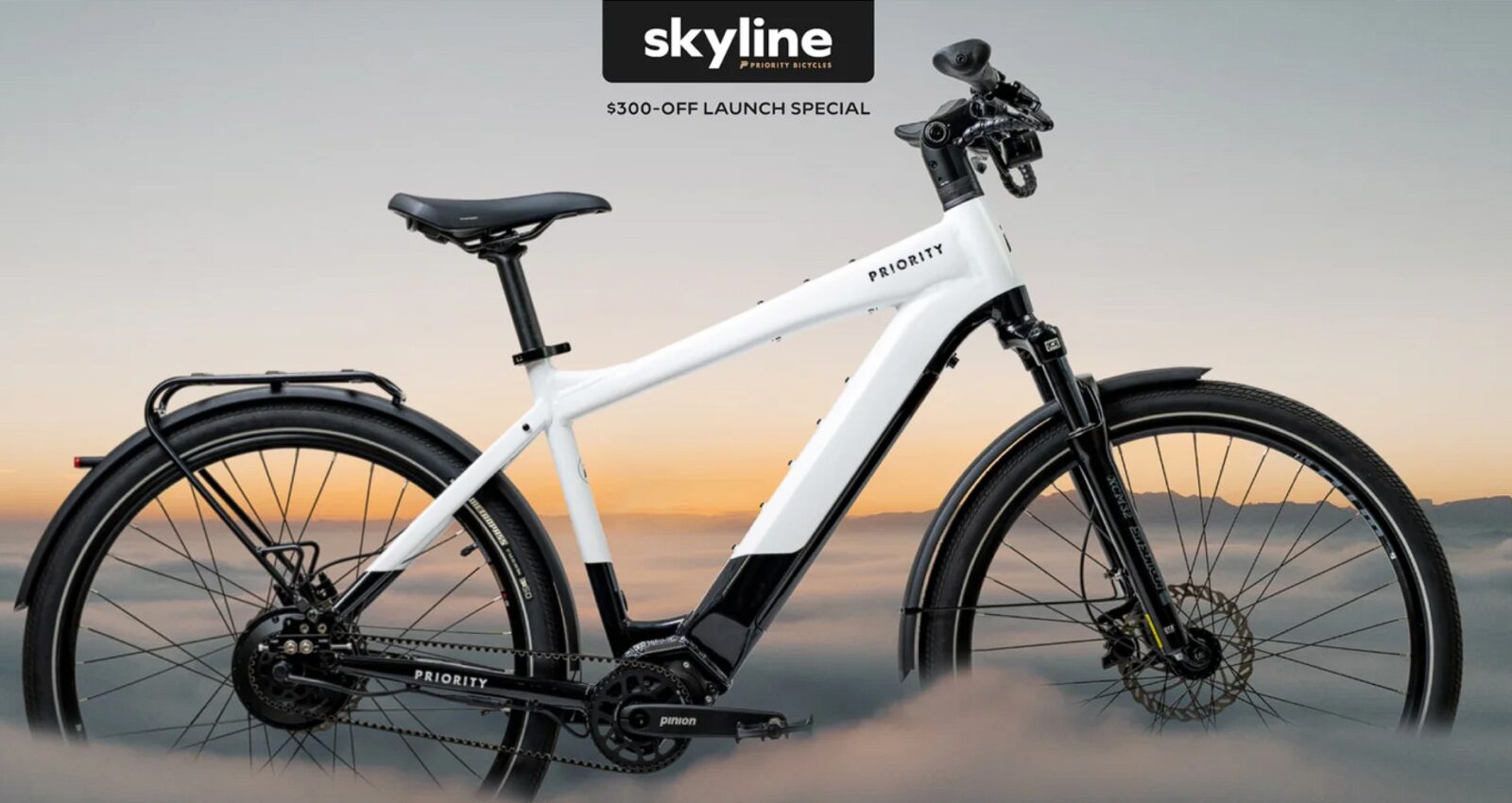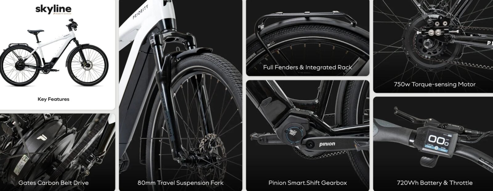 Bardziej przyziemne cechy Priority Skyline obejmują ramę z aluminium 6061, która występuje w trzech rozmiarach dla użytkowników o wzroście 163-190 cm oraz waga sięgająca 30,8 kg, a bierze się to nie tylko z zaawansowanego napędu, ale też wyposażenia. Obejmuje ono bowiem amortyzowany widelec SR Suntour XCM 32 (80 mm skoku), hydrauliczne hamulce tarczowe Tektro (180 mm), odporne na przebicia opony Maxxis Metropass 650×50 mm z odblaskowymi bokami, przednie oświetlenie LED (500 lumenów), tylne światło z funkcją stop, pełne błotniki ze stopu zintegrowane z bagażnikiem, nóżkę centralną i punkty mocowania dla szeregu dodatkowych akcesoriów.
