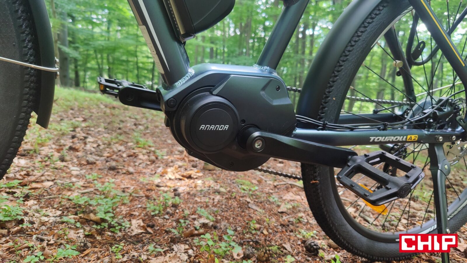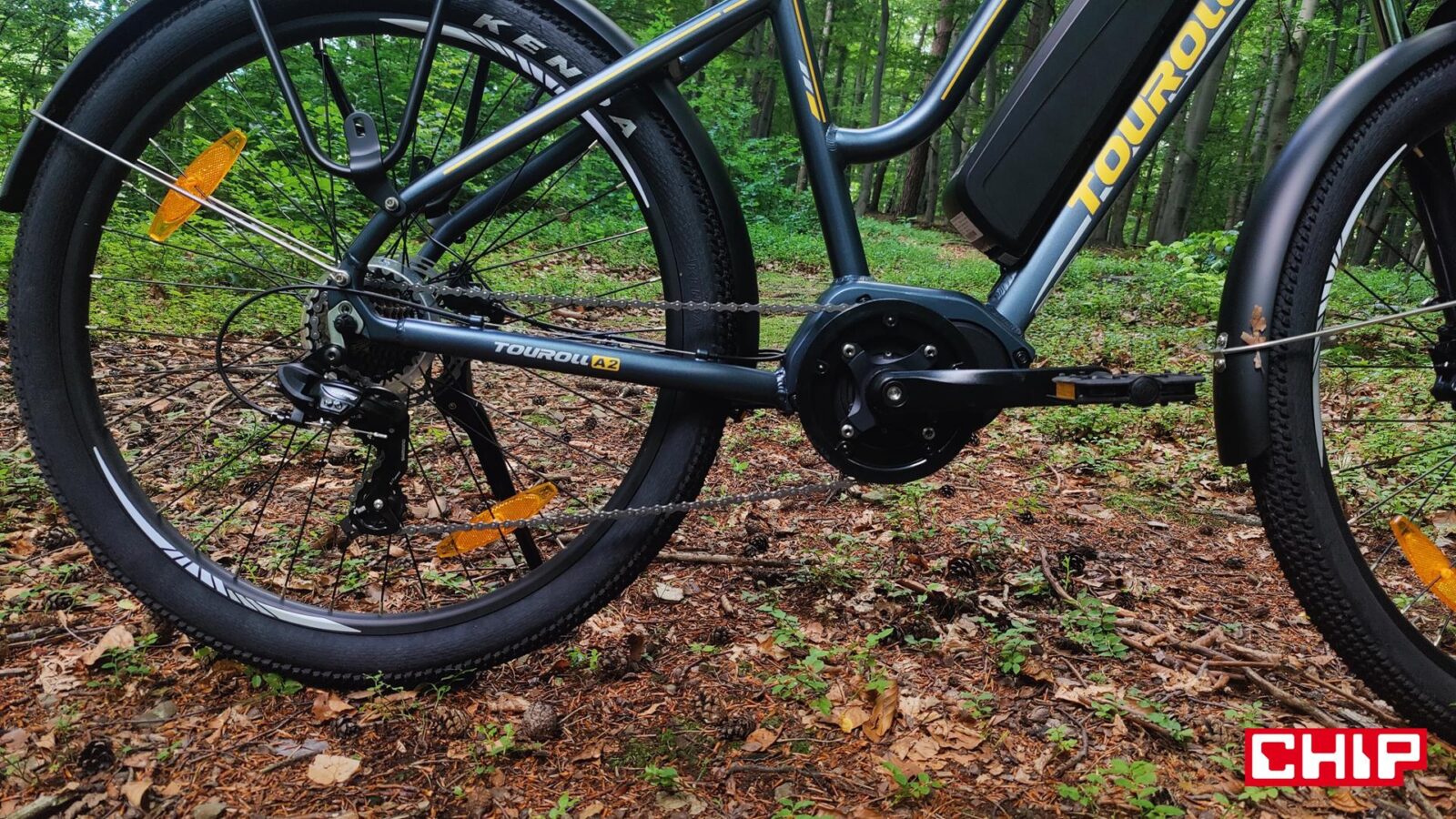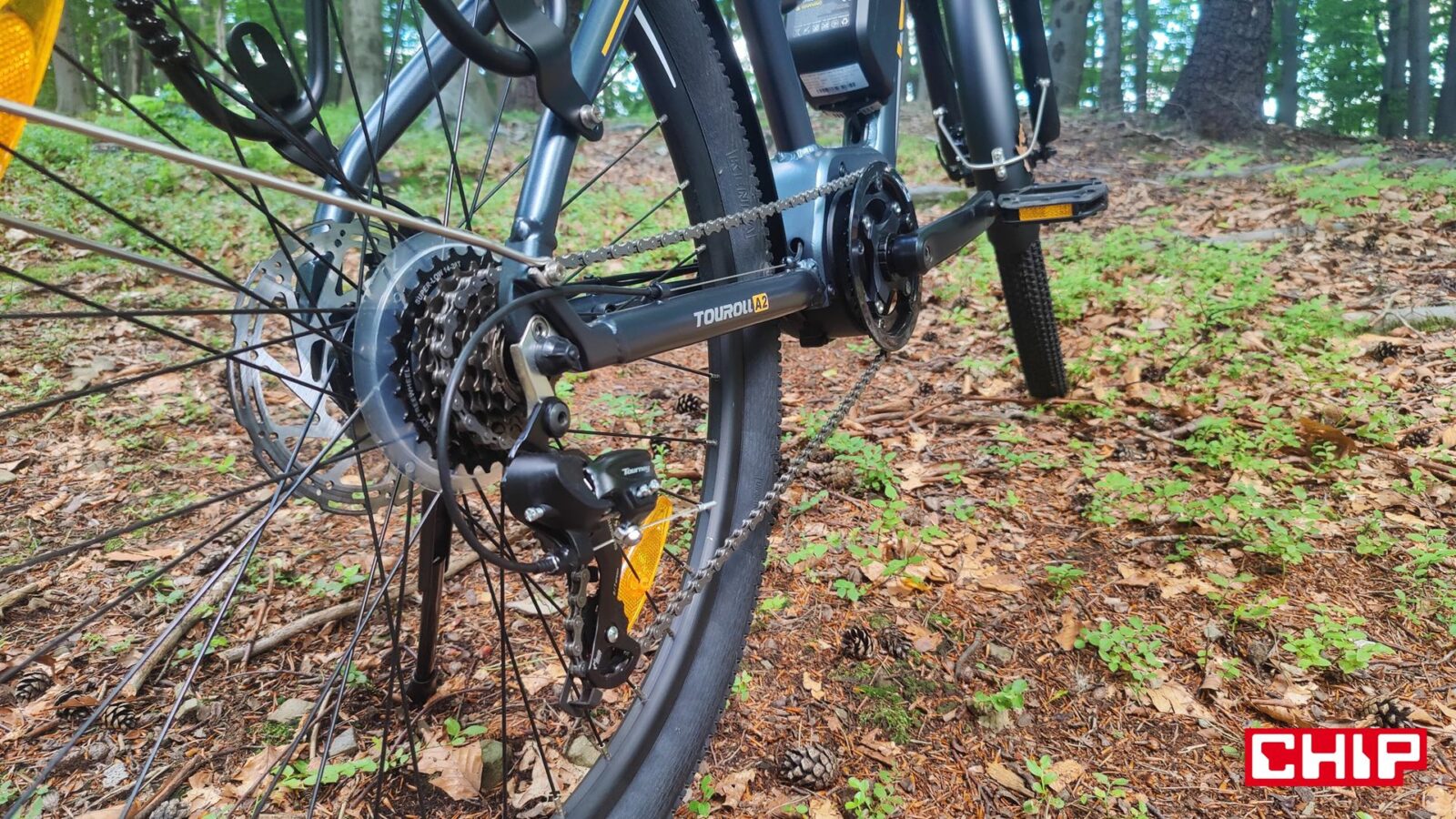 Kwestia zmęczenia i prędkości jest z kolei bardzo ciekawa na tym rowerze, a to dzięki silnikowi między korbami zamiast w piaście tylnego koła. Taka konfiguracja na swoje wady i zalety, bo z jednej strony wspomaganie w takim e-bike jest bardziej naturalne i w efekcie mamy wrażenie “supermocy” w nogach, ale z drugiej… no właśnie. Mamy taką supermoc w nogach i każda zmiana przerzutki pod górkę nam o tym przypomina, a podstawowy układ napędowy to niestety nie markowa mieszanka. Wprawdzie w grę wchodzi sprawdzona, 7-biegowa grupa Shimano Tourney, ale wolnobieg (ATA) i łańcuch to już mniej markowe rozwiązania, a to oznacza, że ich zużycie będzie (najpewniej) postępować znacznie szybciej. Nie pomaga w tym (finansowo) konieczność wymiany całego tylnego koła w razie chęci pozbawienia się wolnobiegu na rzecz bardziej zaawansowanej kasety. Jest to jednak coś, co przypomni o sobie dopiero po kilku latach użytkowania roweru… a potencjalnie nawet nigdy, jeśli Touroll MA2 nie będzie zbytnio eksploatowany do granic, a rowerzysta odpowiednio o niego zadba.