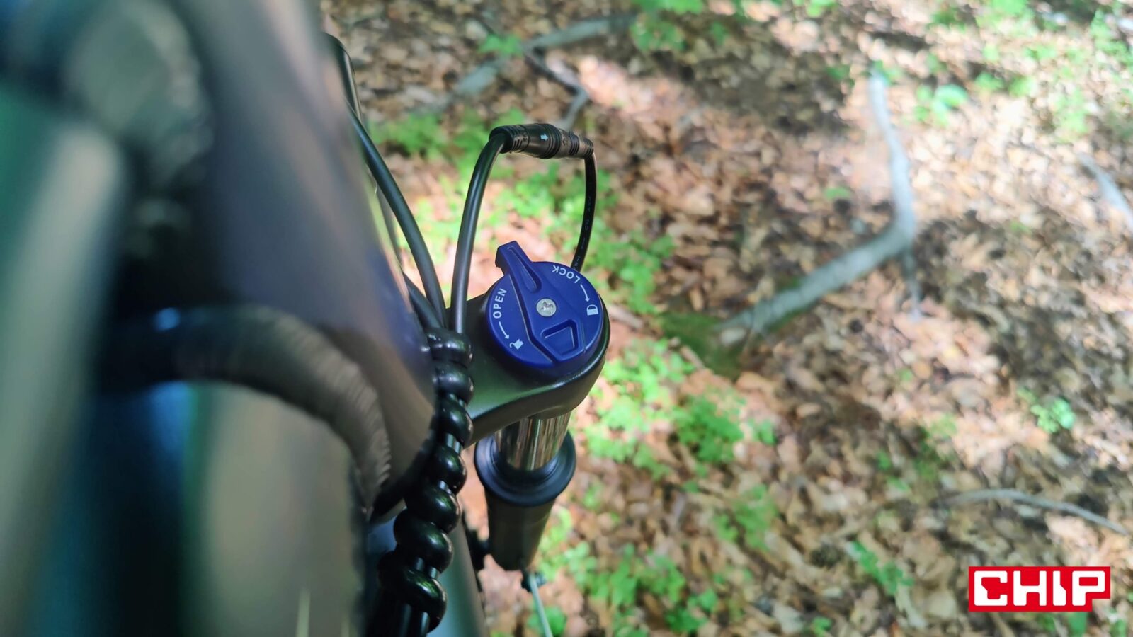 Chociaż Touroll MA2 wygląda jak rower do miasta, to jego terenowe opony 27,5 × 2,1 cala nierenomowanej firmy, które możemy pompować do 30-45 PSI (zalecane 35-40 PSI), sprawdzają się nadspodziewanie dobrze na szutrze i leśnych ścieżkach. Trzy grosze dorzuca do tego przedni amortyzator o skoku 80 mm z opcją blokady i regulacji. Jest on fabrycznie zestrojony na dosyć twardy charakter, a podczas jazdy bardzo szybko można go docenić, bo wygładza wszelkie nierówności. Nie jest to zawieszenie na górskie szaleństwa, ale gwarantuje zwiększony komfort na miejskich krawężnikach i w lekkim terenie.