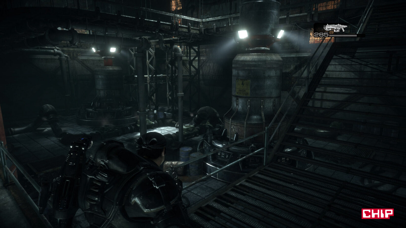 System strzelania opiera się głównie na wspomnianych zasłonach. Nasz bohater jest przyklejony do każdej ściany lub murku na swojej drodze i to głównie zza zasłon wystrzeliwujemy nieskończone ilości pocisków. Głównie wykorzystując do tego najlepszy rodzaj broni – karabin Lancer. Wiecie, to ta broń z piłą łańcuchową na końcu i tak, piłę wykorzystujemy do przecinania wrogów oraz niszczenia niektórych elementów otoczenia. To Lancer zapewnia najbardziej precyzyjny ostrzał (pomijając bardzo wolny karabin snajperski), ciągły ogień i bardzo minimalny odrzut. Inne bronie nam tego nie dają.