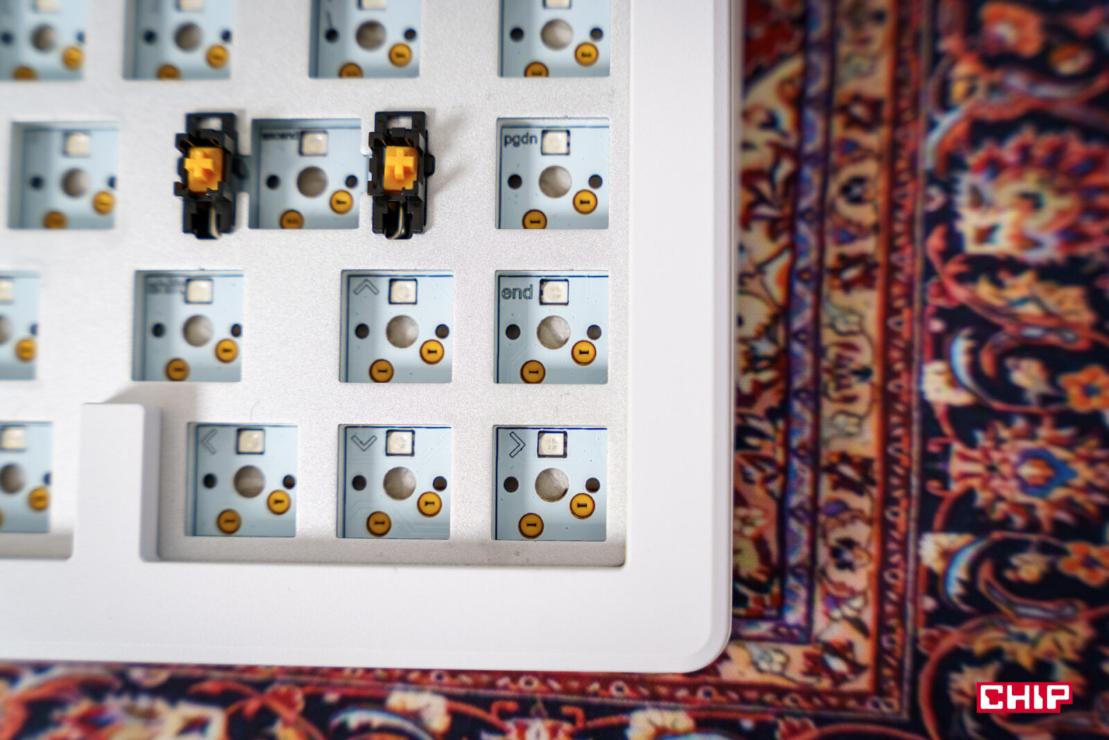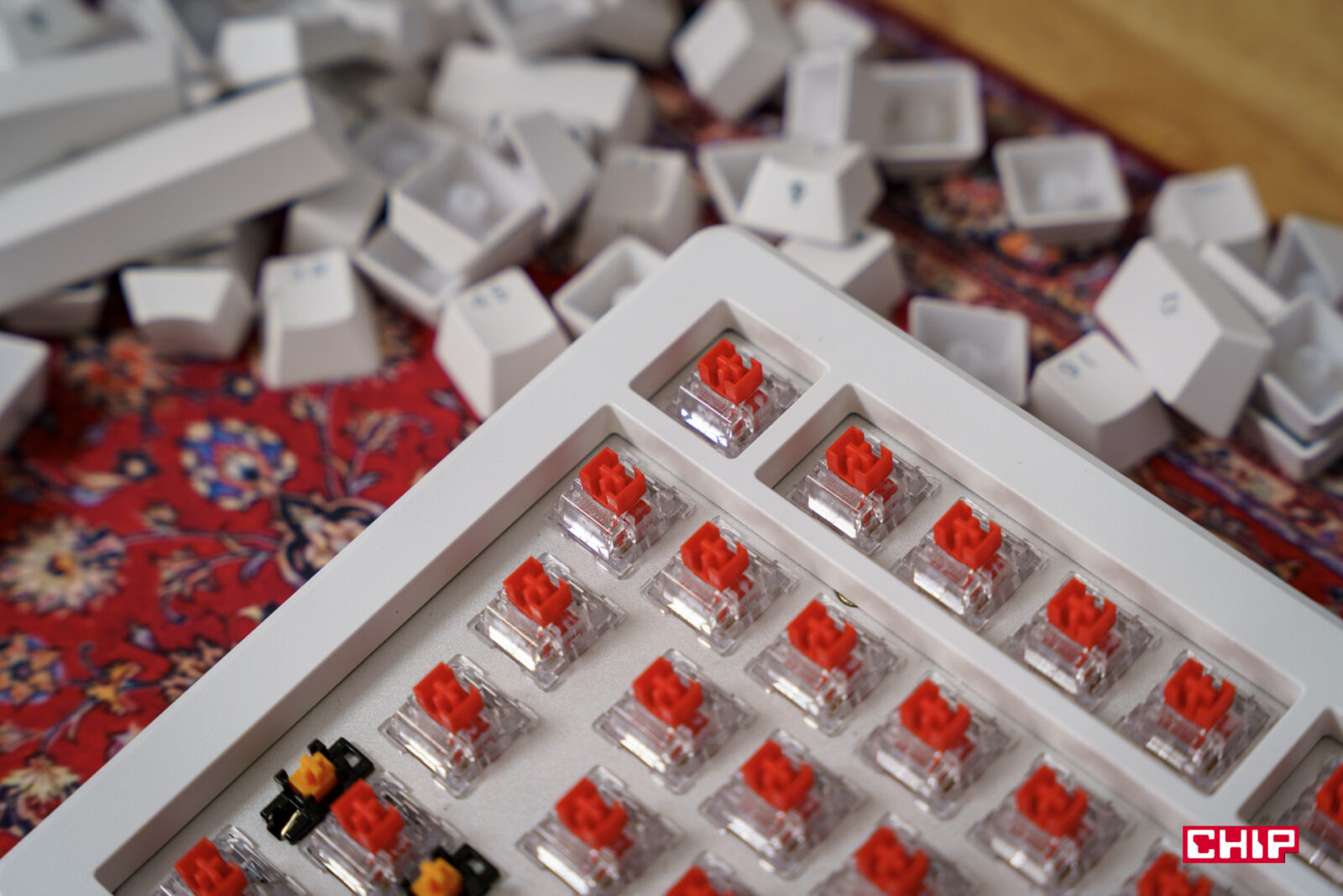 Ostatni z elementów do wymiany to klawisze. Widoczne na zdjęciach to przyciski bazowe, najbardziej podstawowe dla tego modelu. W zanadrzu mam przełączniki Arctic White, które mają jedną wadę – nie mają oznaczeń skrótów, w które domyślnie uzbrojone są przyciski F1-F12. Da się to przeżyć i zapewne zmiana jeszcze przede mną.