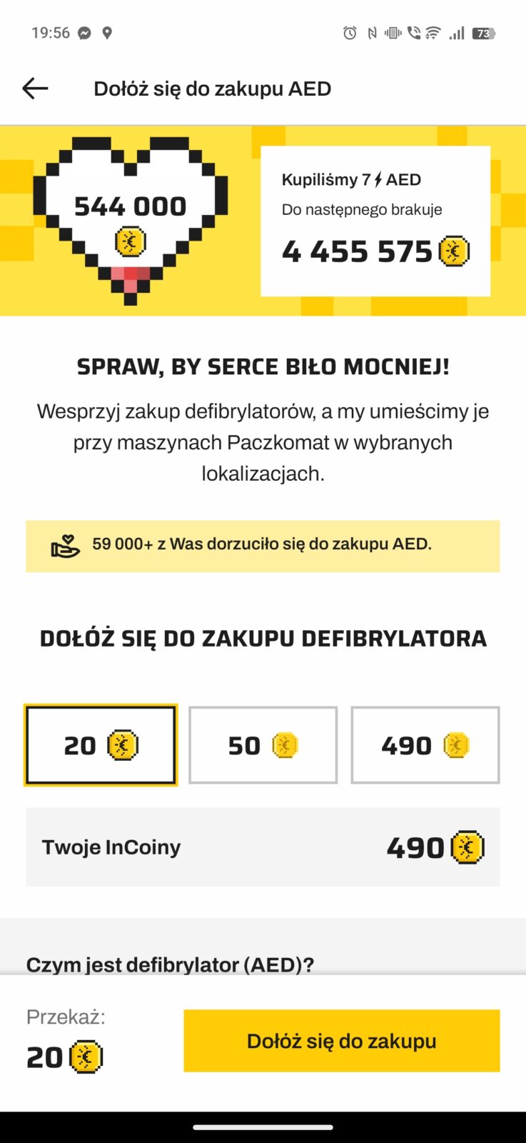 InPost chce, by dostępność stacji Helpbox 365 stale rosła i zachęca nas, abyśmy pomogli w tej inicjatywie. Możemy to zrobić za pośrednictwem aplikacji InPost Mobile, gdzie za każdą odebraną i nadaną paczkę gromadzimy walutę – InCoiny, zazwyczaj służącą wymianie na zniżki lub okres dostępu do wybranych serwisów. Po wybraniu baneru w górnej części aplikacji zostaniemy przekierowani do specjalnego ekranu, gdzie będziemy mogli zdecydować o tym, ile wirtualnych monet przekażemy na sprawę.