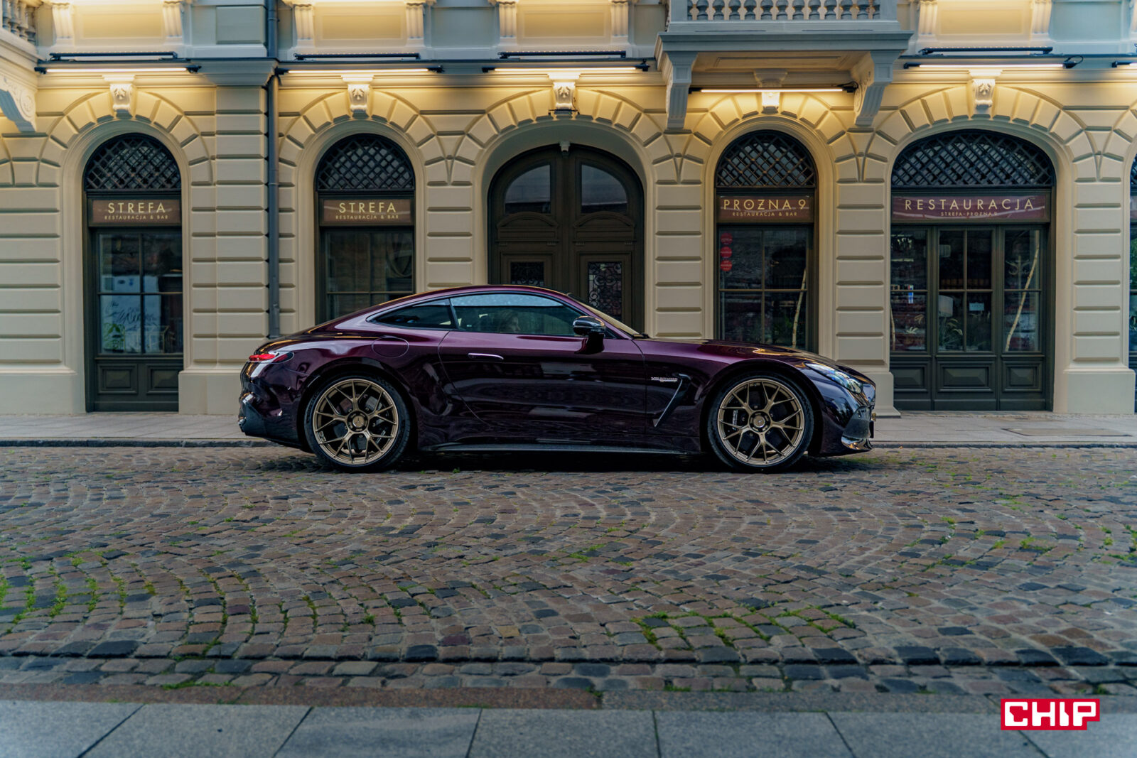 Nie ma tu żadnych przesadzonych przetłoczeń. Ani ma masce, ani na bokach. Z boku mamy za to obłędne 21-calowe felgi w złotym kolorze, które idealnie kontrastują z fioletowym kolorem testowanego egzemplarza. Za nimi chowają się niedorzecznie ogromne tarcze hamulcowe, na których moglibyśmy usmażyć obiad dla całej rodziny. Co też warto podkreślić, o ile z przodu, jak i z tyłu Mercedes-AMG GT 63 S E Performance prezentuje się bardzo agresywnie, tak z boku jest autem do bólu eleganckim.