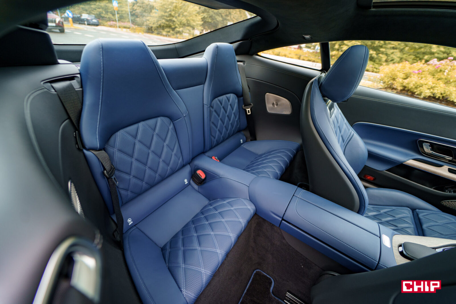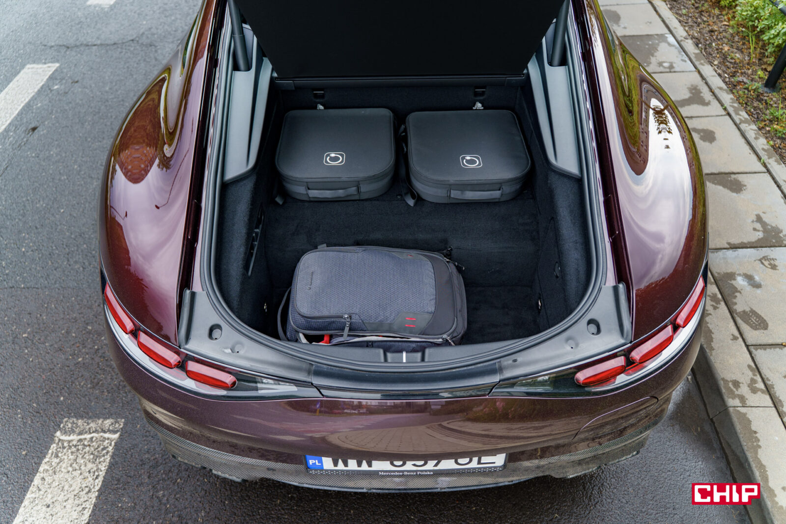 Miejsce z tyłu – jakieś jest. O ile we wspomnianym SL-u 63 nawet dałoby się z niego skorzystać przy rozłożonym dachu, tak Mercedes-AMG GT 63 S E Performance to jest zdecydowanie auto 2-osobowe, a z tyłu posadzimy tylko małe dziecko. W zasadzie to oficjalnie jest auto 2-osobowe. Przy 183 cm wzrostu dach miałem w okolicach barków. Próbowaliśmy tam wpasować osobę o wzroście ok 170 cm z bardzo podobnym skutkiem. Zwyczajnie dach jest za nisko, a i miejsca na nogi za bardzo tu nie znajdziemy. Za to tylna kanapa, jak możemy ją złośliwie nazwać, idealnie sprawdza się jako dodatkowa przestrzeń bagażowa.