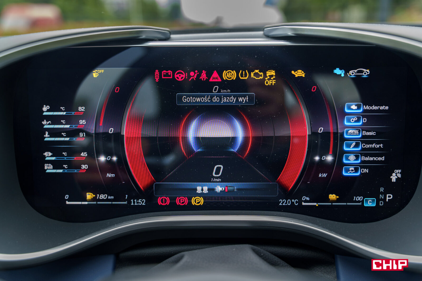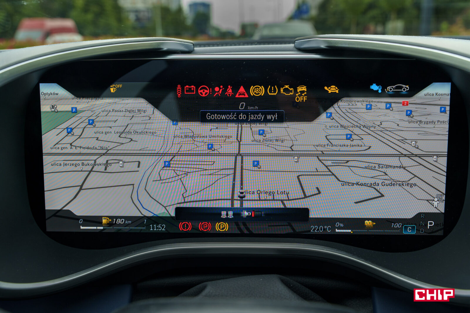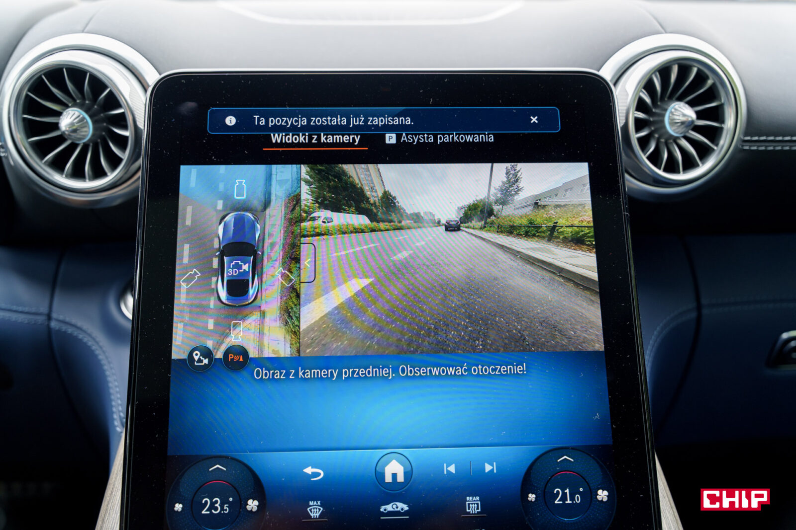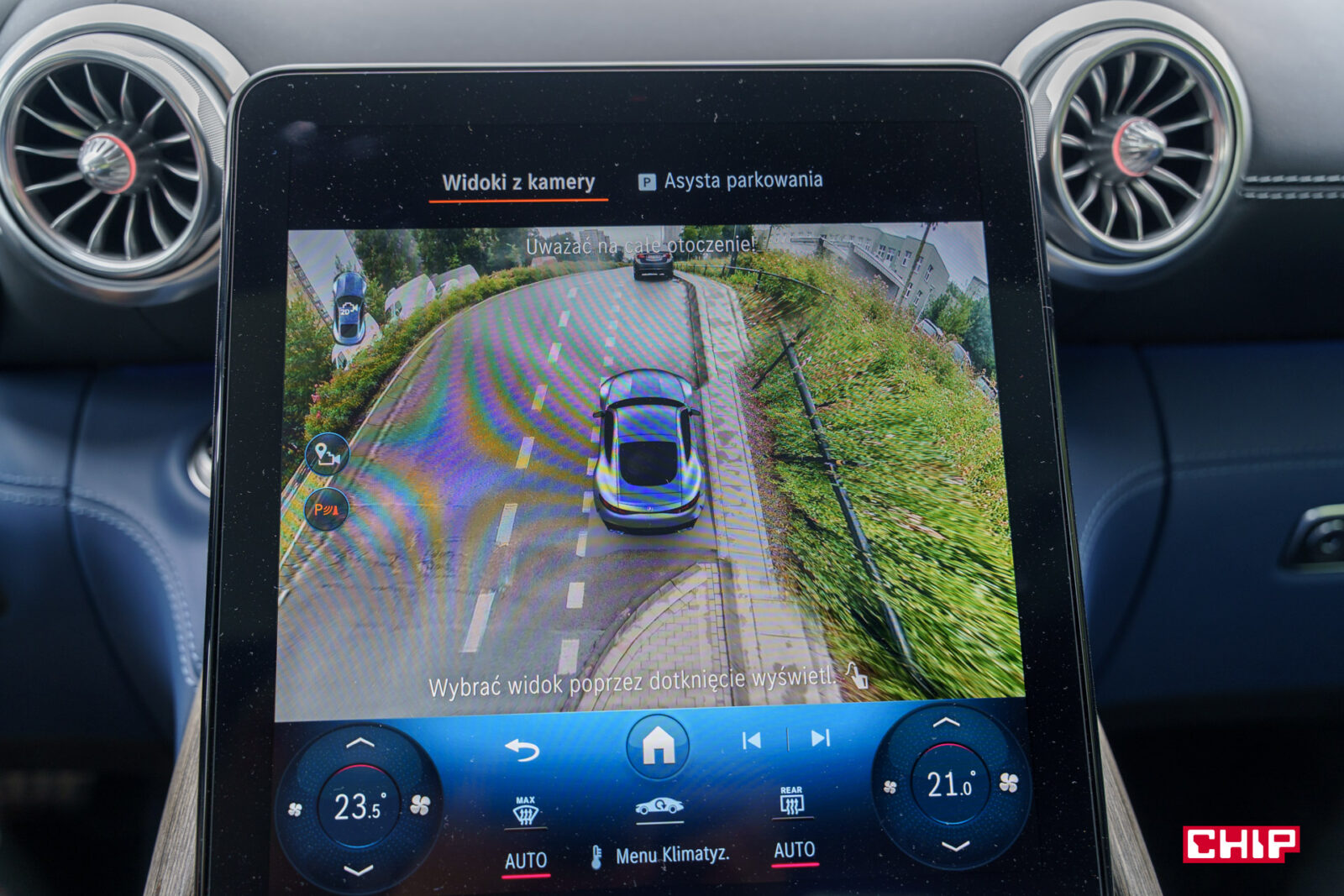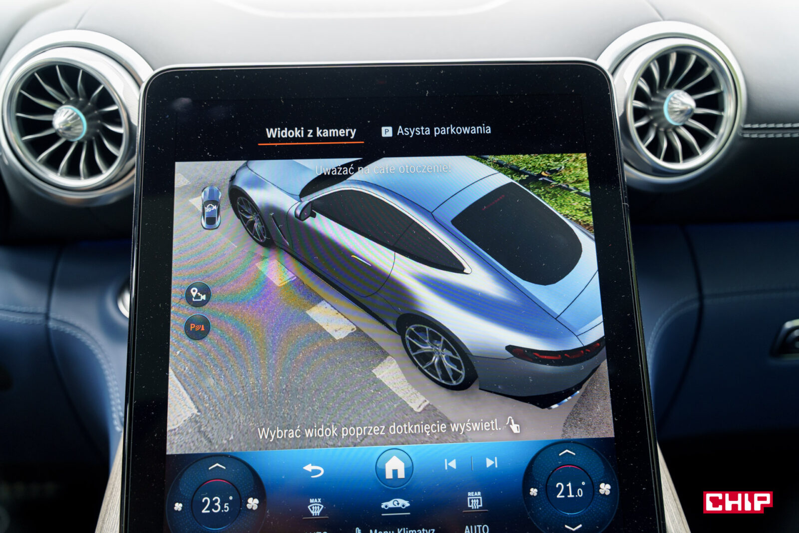 Przy aucie o tak nietypowych kształtach bardzo przydatny jest wzorowo działający system kamer 360. Ze świetną perspektywą, idealnie płynnym obrazem, czytelnym w każdych warunkach. Możemy też zobaczyć widok na koła, co przy takich felgach i ekstremalnie niskim profilu opony bywa niezbędne podczas parkowania.