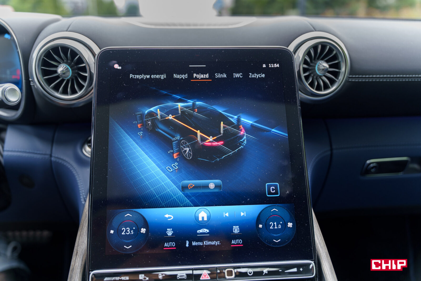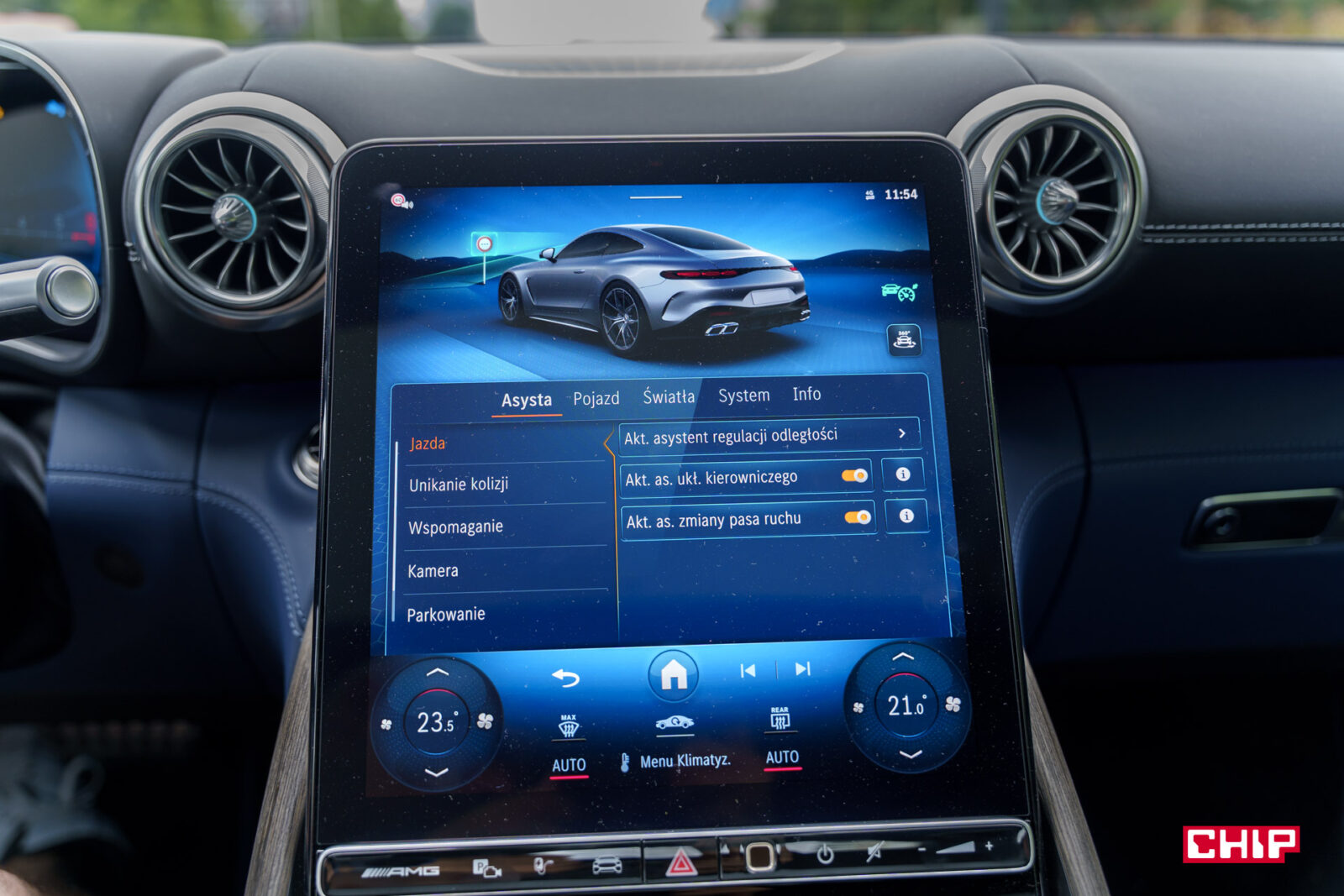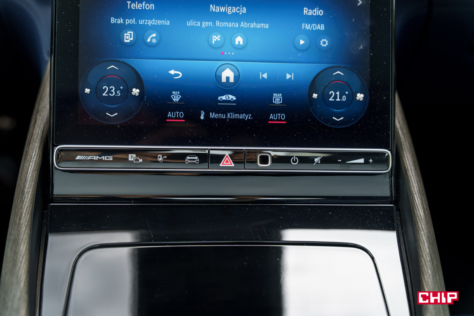 Osobiście najbardziej lubię właśnie zastosowaną tu wersję MBUX-a, choćby ze względu na praktyczny dostęp do regulacji klimatyzacji, który w najnowszych odsłonach został wyraźnie zmniejszony. Tutaj przyciski od sterowania nawiewem i temperaturą mamy zawsze widoczne na ekranie. Sam interfejs działa ze wzorową płynnością, jest intuicyjny, a jeśli nie możemy czegoś znaleźć, z pomocą przychodzi nam asystentka głosowa.