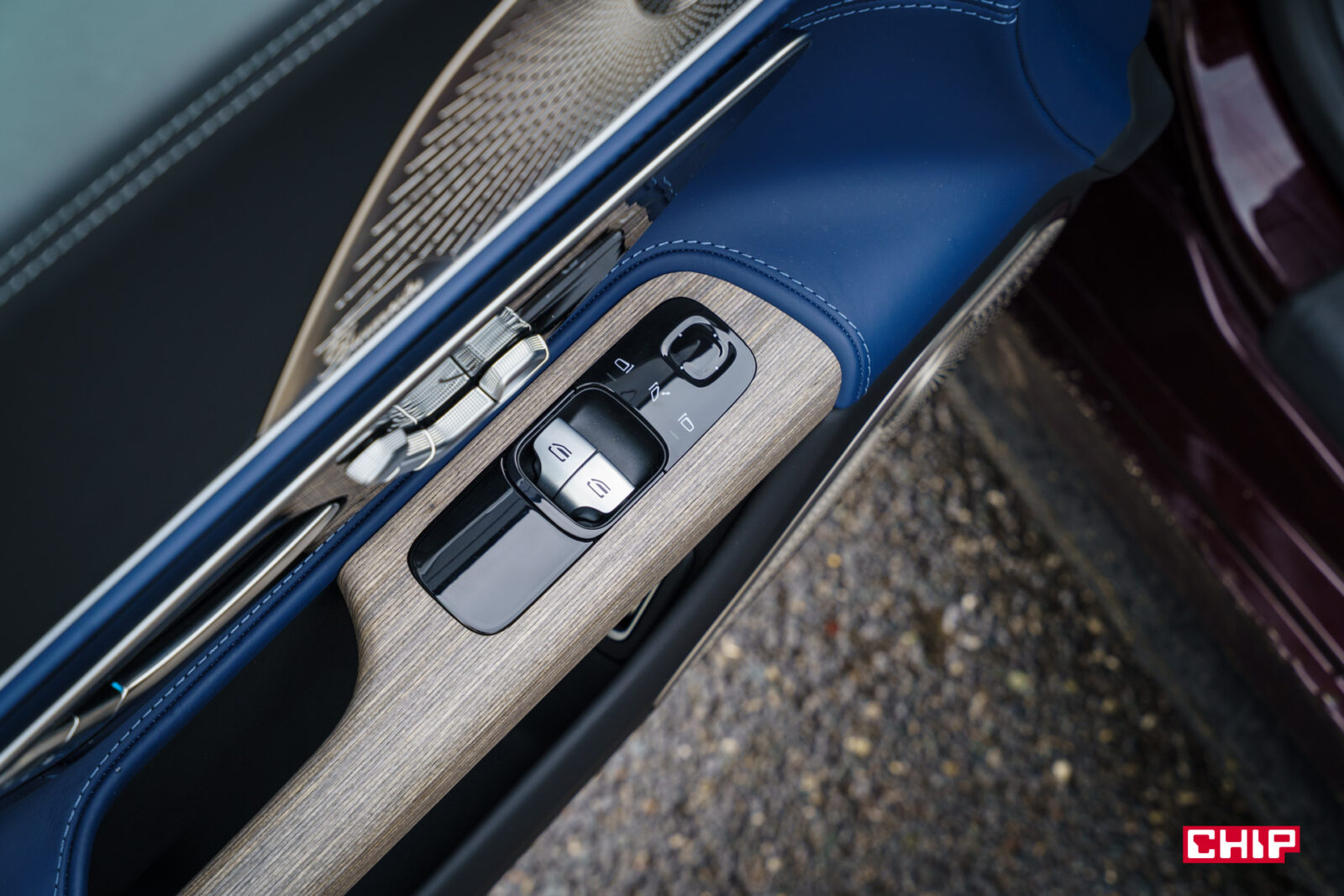 Dziwnie to chyba dobre określenie na połączenie niebieskiej skóry, piano black na konsoli środkowej i jasnego drewna. Spokojnie, to wcale nie musi tak wyglądać, tu zwyczajnie ktoś miał zdecydowanie za dużo fantazji podczas konfiguracji auta.