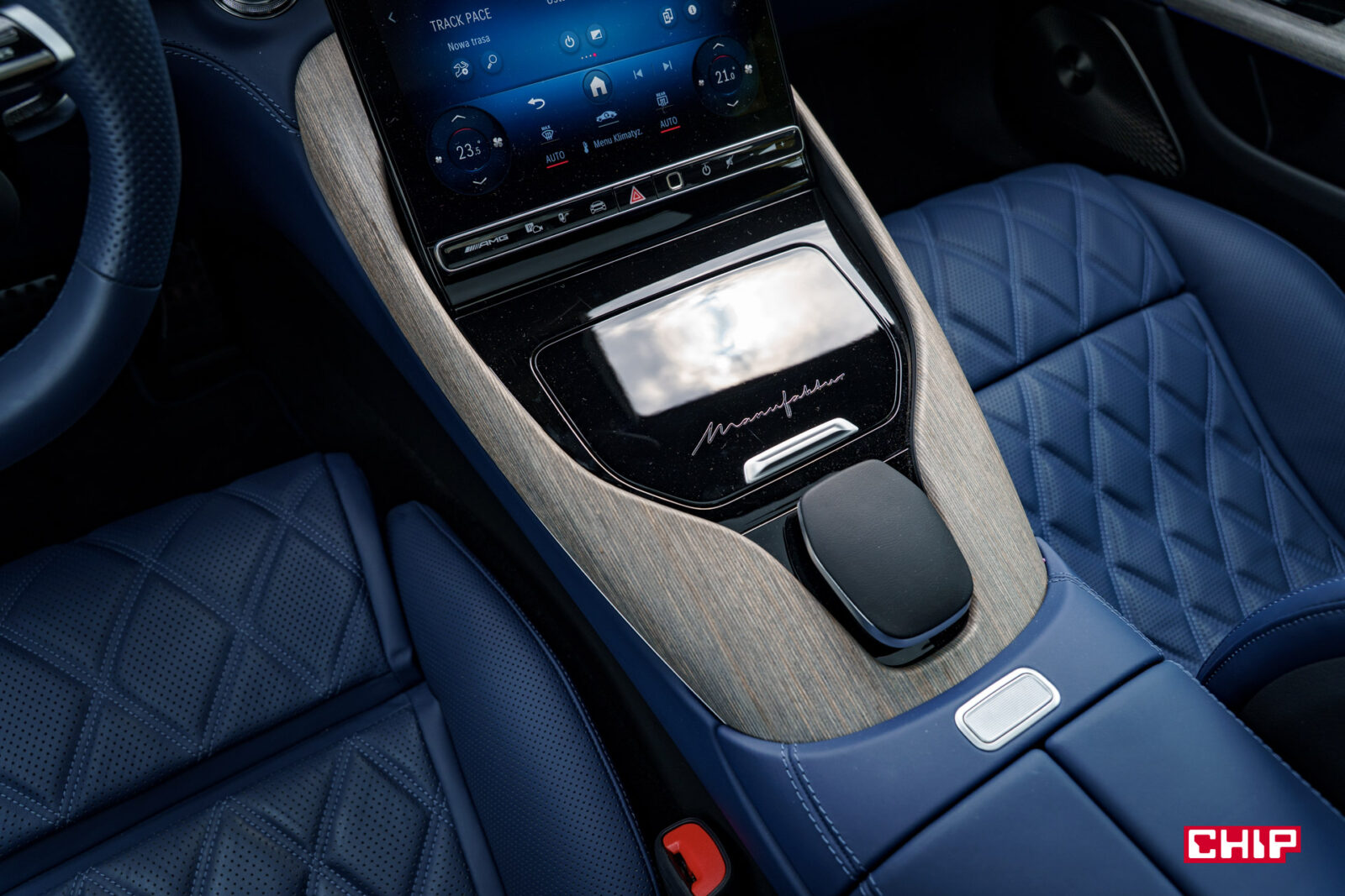 Wracając do AMG GT 63 S E Performance: po pozbyciu się tremy, którą czułam, kiedy do niego wsiadałam (niech pierwszy rzuci kamieniem ten, w kim taka moc nie budzi pokory), z zaskoczeniem stwierdziłam, że jazda po mieście jest nie tylko prosta, ale wręcz przyjemna. Auto wyposażono w cztery tryby jazdy – trzy sportowe i Comfort (nikt normalny nie liczył na Eco) i to właśnie Comfort jest tym w którym AMG GT 63 S ma założony kaganiec. Nie taki, który sprawia, że można je pomylić z konstrukcją przeciętną, ale taki w którym absolutnie nie wyrwie się spod kontroli. Cały czas będzie cholernie dynamiczne, cały czas będziecie słyszeć przyjemny bulgot silnika, ale będzie zachowywało się kulturalnie. Jeśli myślicie, że często będziecie poruszać się na prądzie, bo to w końcu hybryda typu Plug-In – nie liczcie na to. Bateria ma tutaj pojemność 4,84 kWh, więc będzie dobrze, jeśli zdołacie na tym przejechać 10 km. Szczerze mówiąc, nie widzę potrzeby ładowania tej baterii za pomocą kabla, bo przy tak małej pojemności, spokojnie można ją doładować podczas jazdy w trasie.