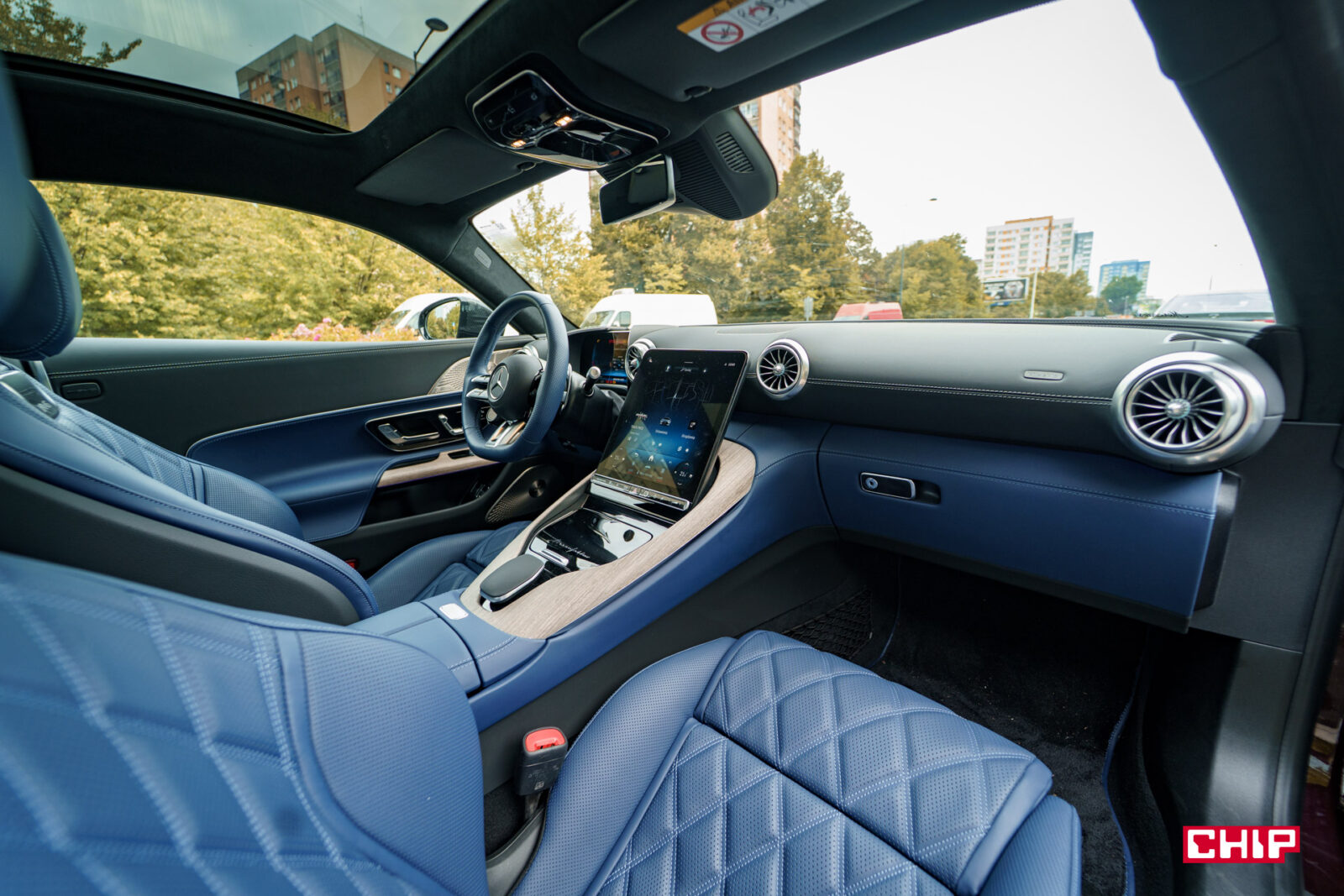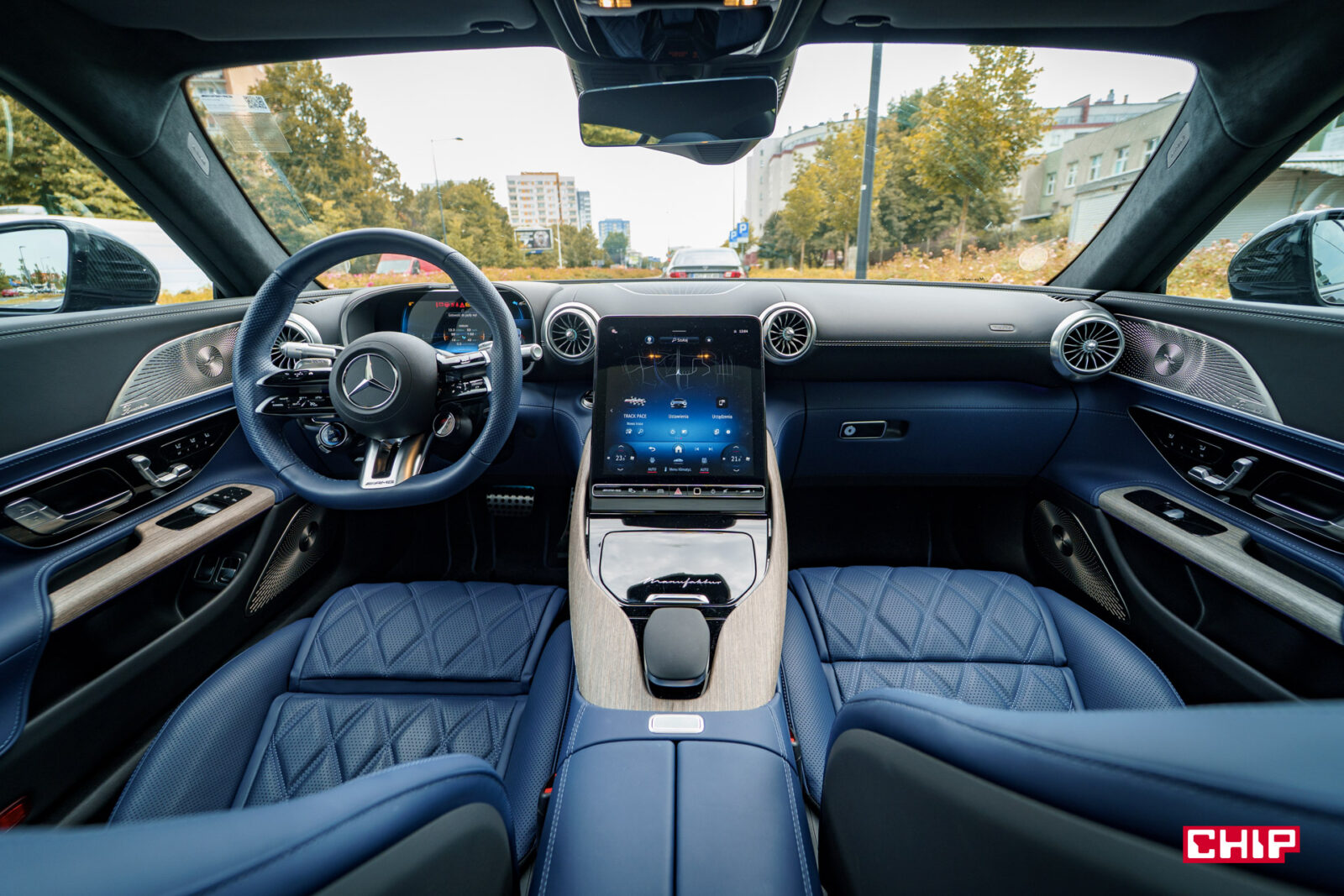 Wprawne oko szybko zauważy, że wnętrze Mercedes-AMG GT 63 S E Performance to praktycznie kopia tego, co znajdziemy w SL-u 63 AMG z dwoma małymi różnicami. Pierwsza to oczywiście dach, który w AMG GT nie jest rozkładany, a druga to ekran. W SL-u można zmieniać kąt jego nachylenia, co ma związek z rozkładanym dachem, bo w tej sposób możemy zniwelować odblaski, a w AMG GT ekran ma jedną, stałą pozycję.
