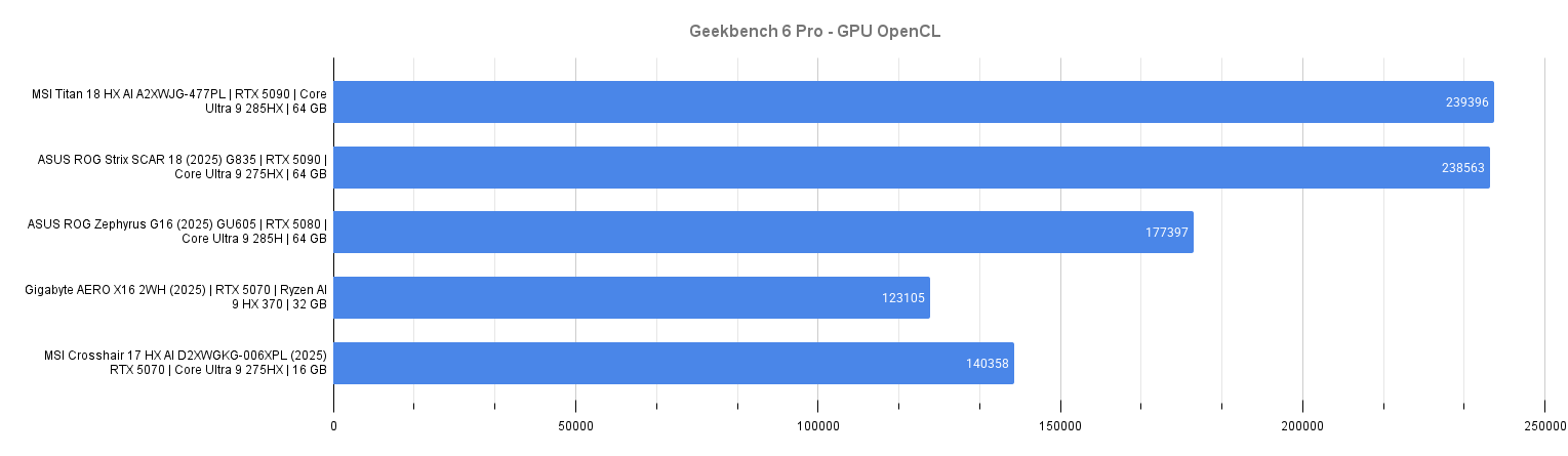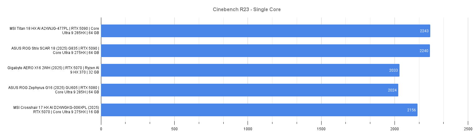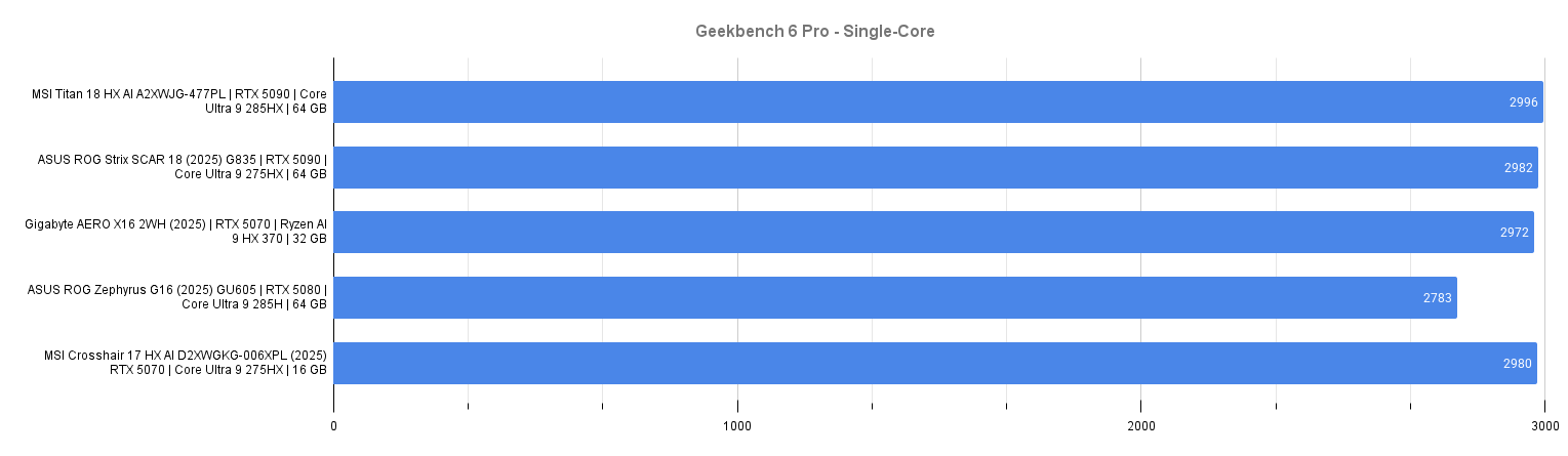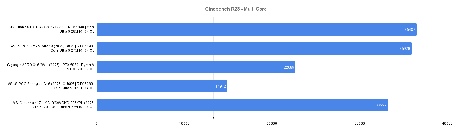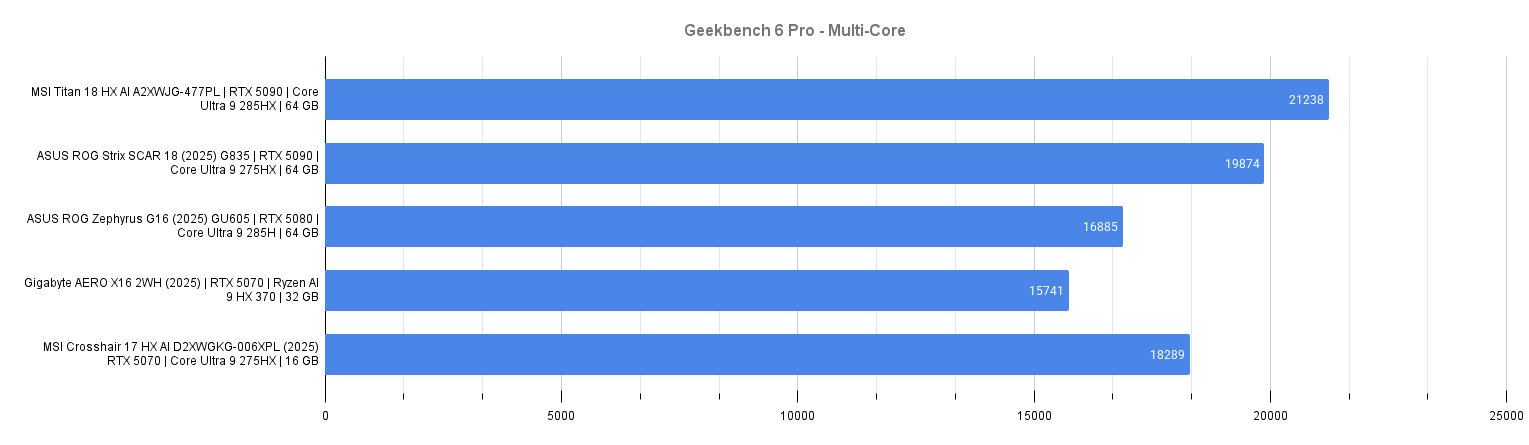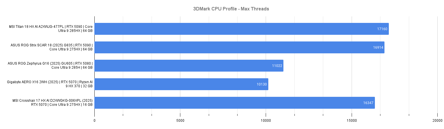 Po stronie CPU Crosshair z Core Ultra 9 275HX trzyma solidną pozycję. W single core zalicza praktycznie remis z 285HX, a w multi core traci zwykle kilka procent do najsilniejszych konfiguracji HX. 3DMark CPU Profile i Cinebench pokazują, że procesor nie będzie tu wąskim gardłem w grach ani w typowych zadaniach.