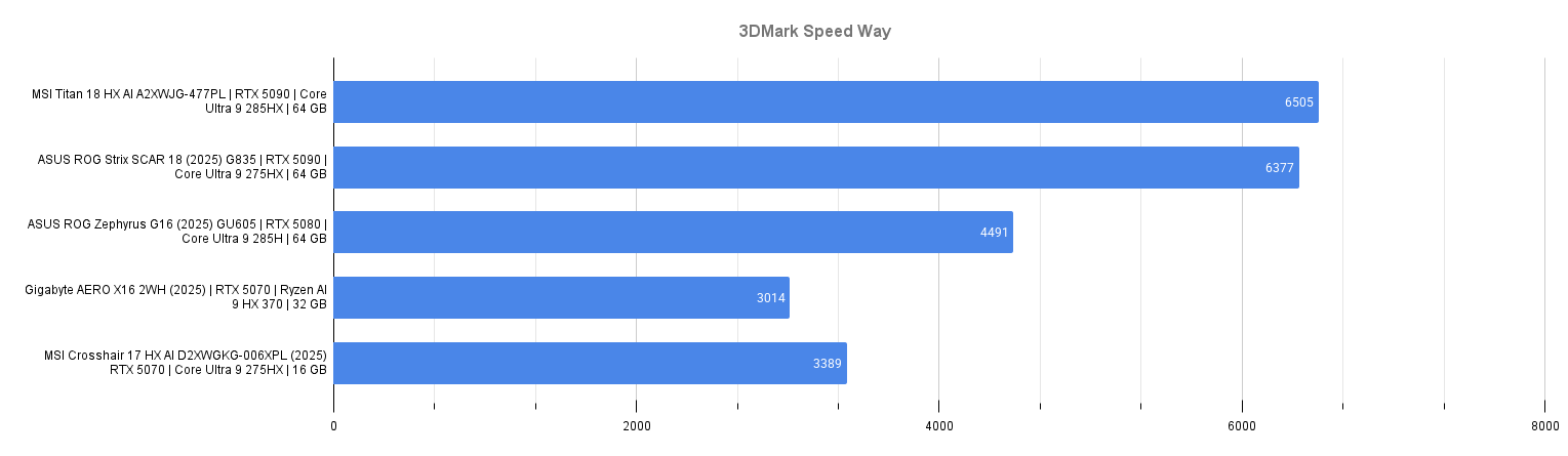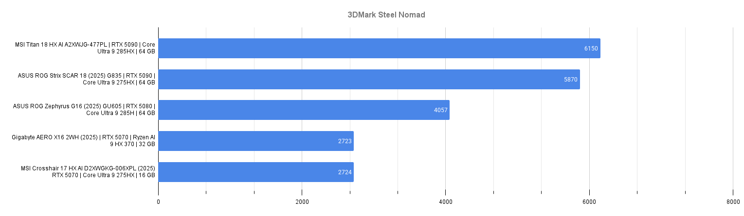 W syntetykach GPU wypada jak typowy RTX 5070 w laptopie z wyższym limitem mocy: w Speed Way jest o krok przed AERO X16, ale wyraźnie za RTX 5080 i mniej więcej o połowę za RTX 5090. W Steel Nomad różnice między dwoma 5070 są już kosmetyczne, a przewaga 5090 nad 5070 znów kręci się wokół x2. W praktyce oznacza to komfortowe 2K bez cięższego RT, a przy RT warto oprzeć się na DLSS i trzymać tekstury w ryzach.