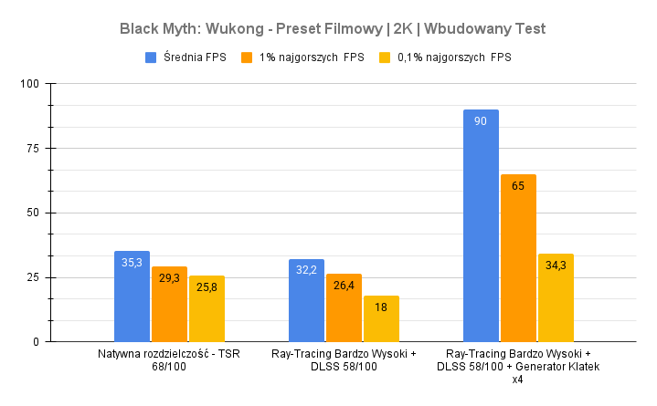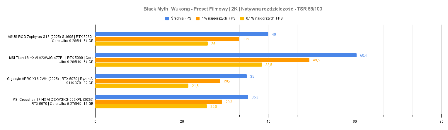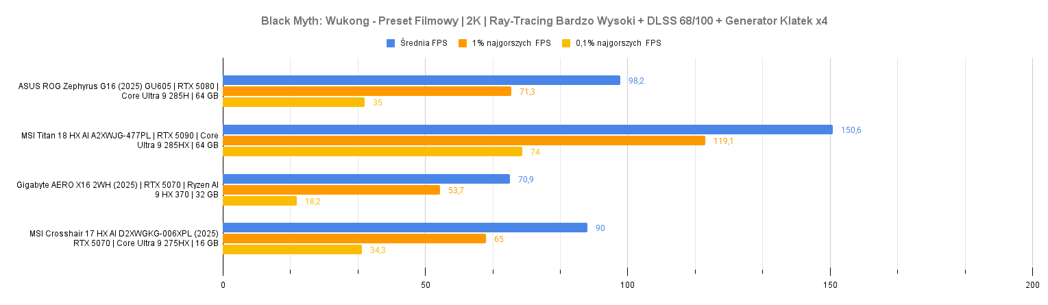 Black Myth: Wukong w natywnym 2K oscyluje wokół 35,3 fps, więc bez upiększeń to granie na styk. RT Bardzo Wysoki + DLSS + FG podbija średnią do 90 fps, choć 0,1% low około 34,3 fps zdradza, że doczyty i 8 GB VRAM potrafią przypomnieć o sobie. Tutaj lepiej kontrolować jakość tekstur i nie przesadzać z RT. Wspólny mianownik jest prosty: Crosshair 17 z RTX 5070 wyraźnie korzysta z DLSS i Frame Generation, często przeskakując bliźniaczy AERO i zbliżając się do 5080 w scenariuszach mocno opartych na technikach Nvidii.