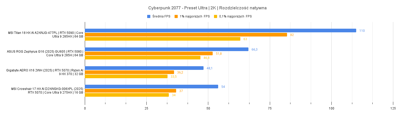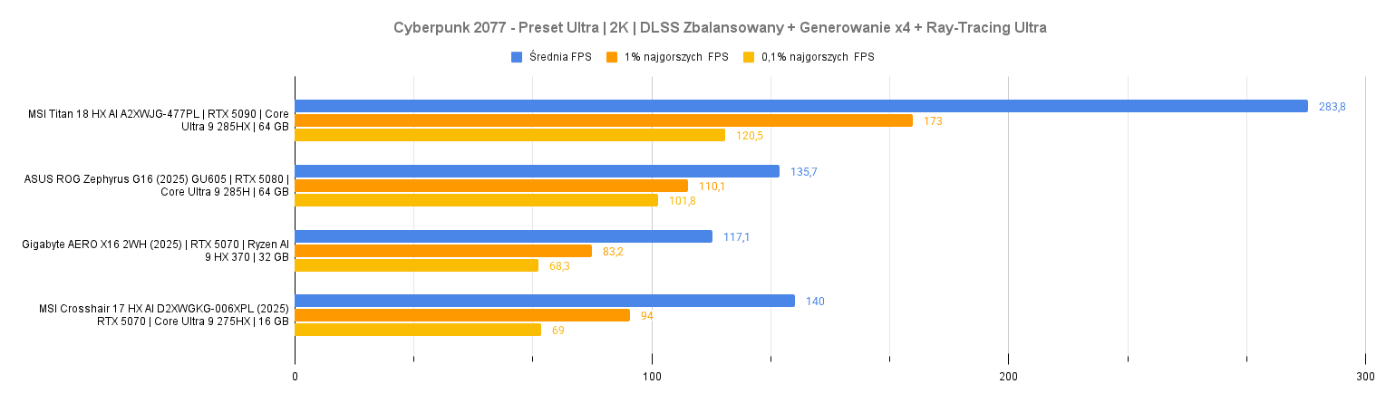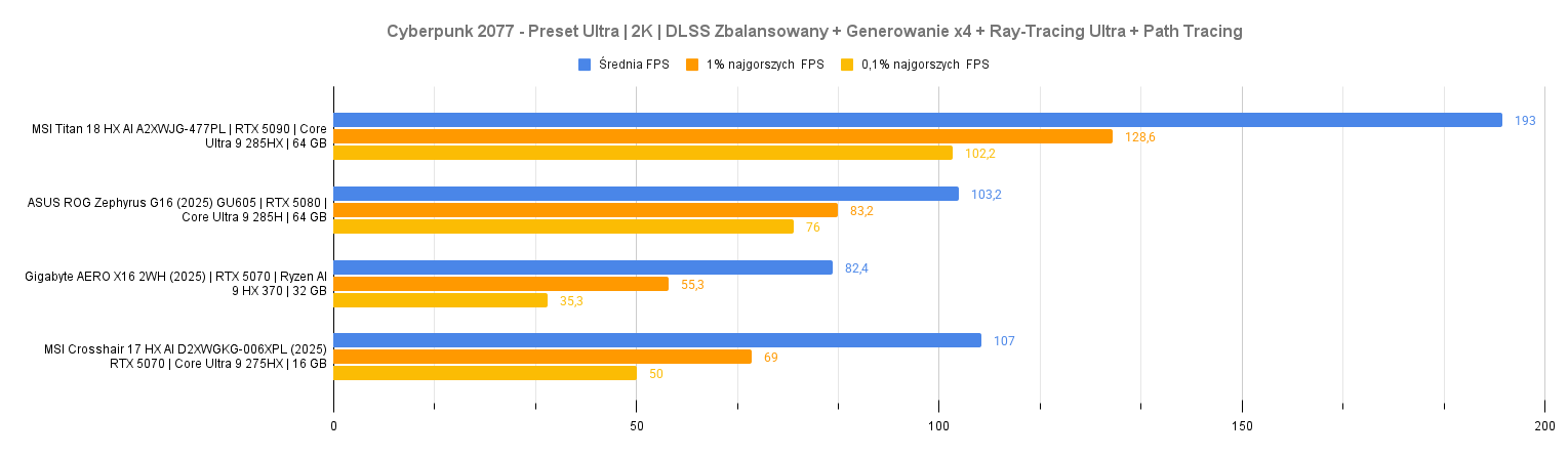 W Cyberpunku 2077 różnica między czystą rasteryzacją a pełnym pakietem Nvidii jest ogromna. Natywne 2K na Ultra to 54 fps z minimami 37/34. Po włączeniu DLSS Zbalansowany + Frame Generation + RT Ultra średnia rośnie do 140 fps, a minima do 94/69. Z Path Tracingiem spada do 107 fps, ale dalej trzymamy płynność i stabilne dołki 69/50. Co ważne, właśnie w tym profilu Crosshair wysuwa się przed Zephyrusa z RTX 5080, co ładnie pokazuje, że przy FG i RT ograniczenie częściej leży poza samą rasteryzacją.