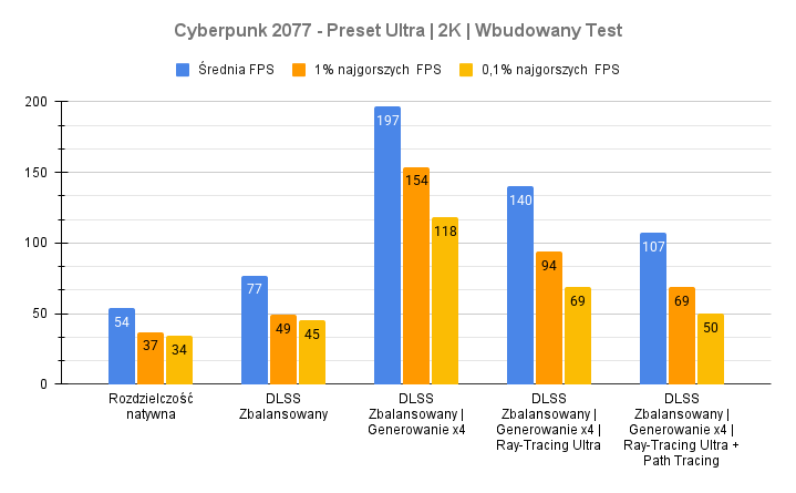 Cyberpunk 2077 to fenomenalna gra. Nie tylko z punktu widzenia gracza, ale też testera, bo zapewnia relatywnie spójne wyniki między pomiarami, a do tego wspiera wszystkie nowoczesne techniki, a w tym path-tracing. Zanim jednak przejdziemy do wydajności przy konkretnych ustawieniach, zatrzymajmy się na tym, jak ta gra wypada w kwestii spójności zależnie od trybu pracy.