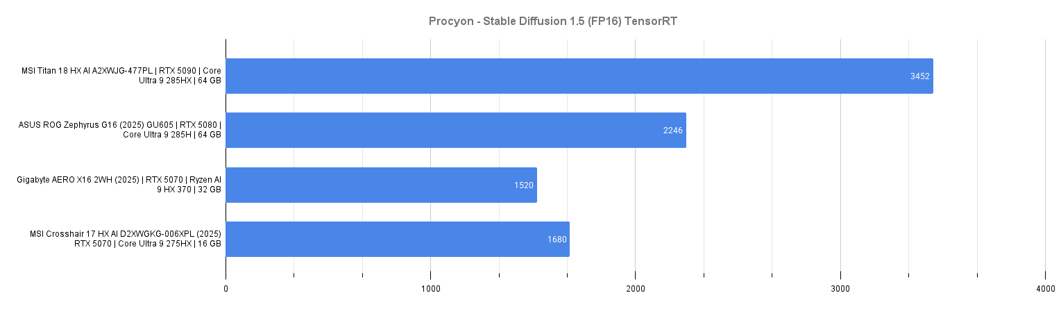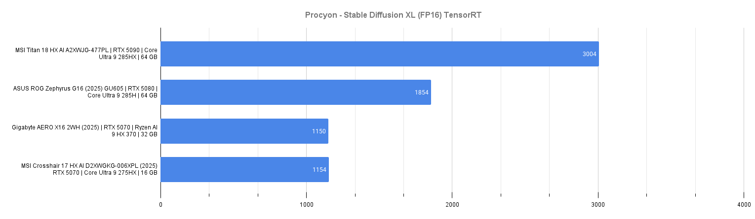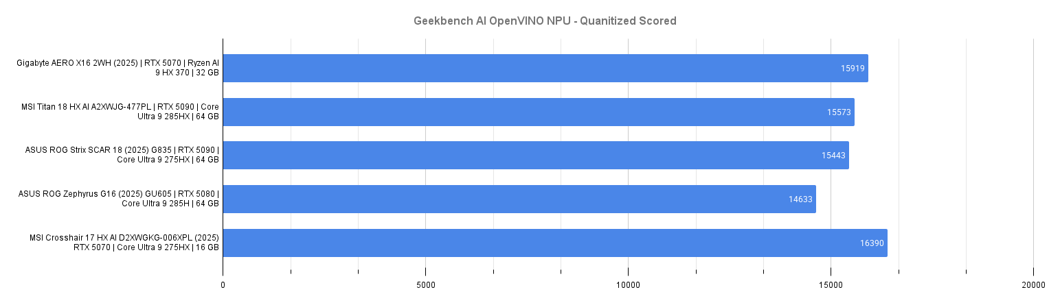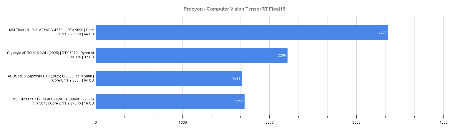W obliczeniach SI MSI Crosshair 17 HX AI D2XWGKG-006XPL ma dwie twarze. Na OpenVINO NPU notuje najlepszy wynik w zestawieniu, co pokazuje, że Intelowy NPU w tej maszynie jest dobrze wykorzystany. Gdy wchodzimy w ONNX DirectML i testy TensorRT zależne od GPU, Crosshair zachowuje się jak 5070: w SD 1.5 FP16 i INT8 jest wyraźnie za 5080 i daleko za 5090, a w SD XL FP16 wynik zrównuje się z AERO, co sugeruje ograniczenia pamięci i przepustowości. Podsumowując – Crosshair 17 ma bardzo mocny CPU, solidny NPU i wydajność GPU adekwatną do RTX 5070, więc do pracy i 2K w grach nadaje się świetnie, ale w nowszych tytułach i ciężkim RT trzeba pilnować ustawień i VRAM.