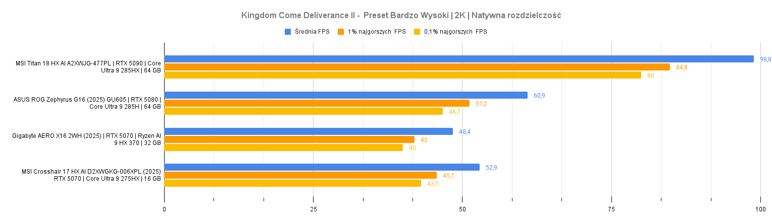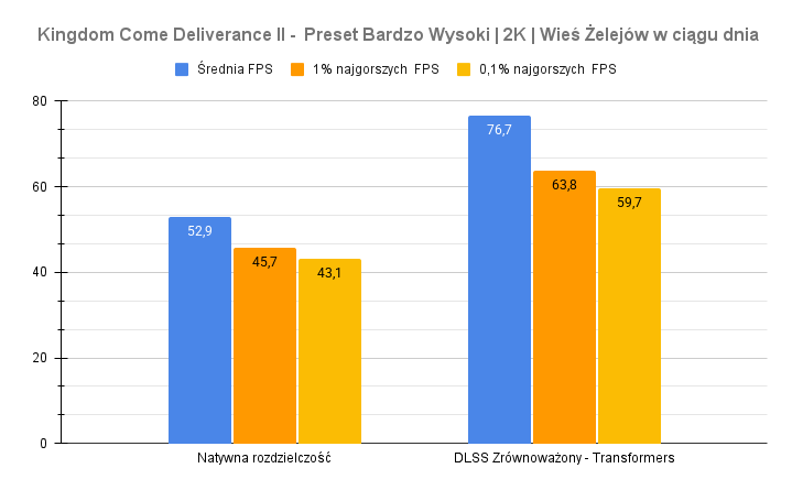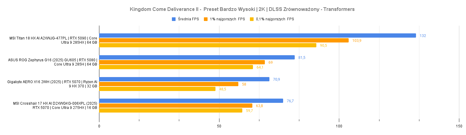 Kingdom Come Deliverance II lubi DLSS Transformers. Z 52,9 fps na natywnej rozdzielczości robi się 76,7 fps, a minima podnoszą się z 45,7/43,1 do 63,8/59,7. Animacja jest wyraźnie spokojniejsza, a Crosshair zbliża się do 5080, zostawiając AERO X16 z tym samym 5070 kilka klatek w tyle.
