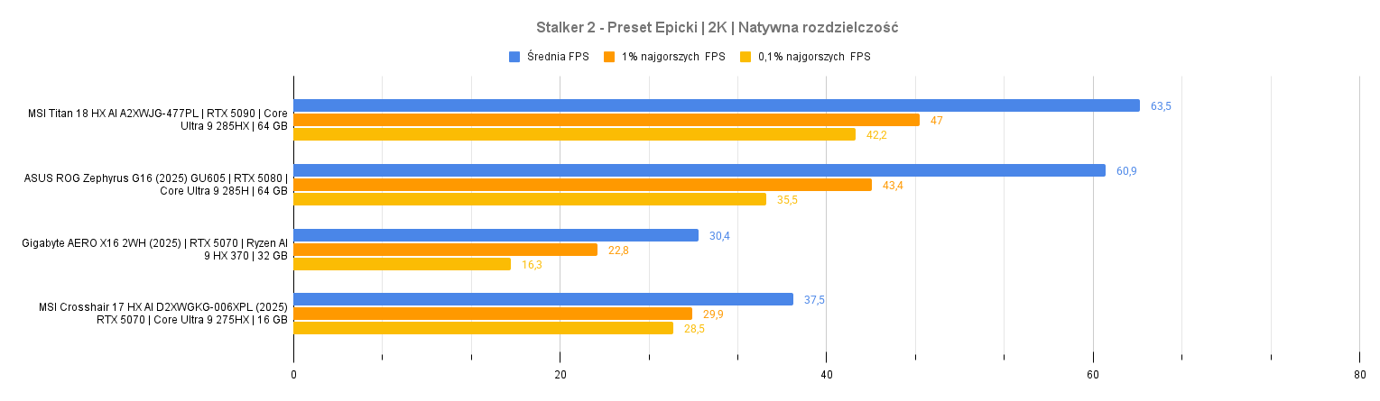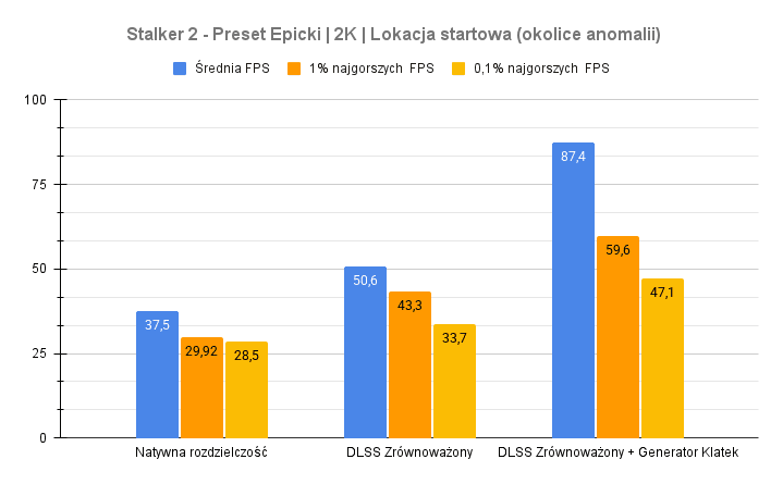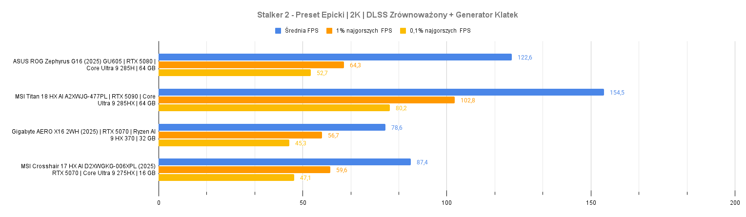 Stalker 2 to jeszcze mocniejszy argument za DLSS + FG. Natywne 2K to 37,5 fps i 29,9/28,5 w dołkach. Po przełączeniu na DLSS Zrównoważony z generowaniem klatek mamy 87,4 fps i 59,6/47,1. Średnia idzie w górę ponad dwukrotnie, a minima przestają przeszkadzać w walce. Do 5080 i 5090 jeszcze brakuje, ale przewaga nad AERO jest wyraźna.