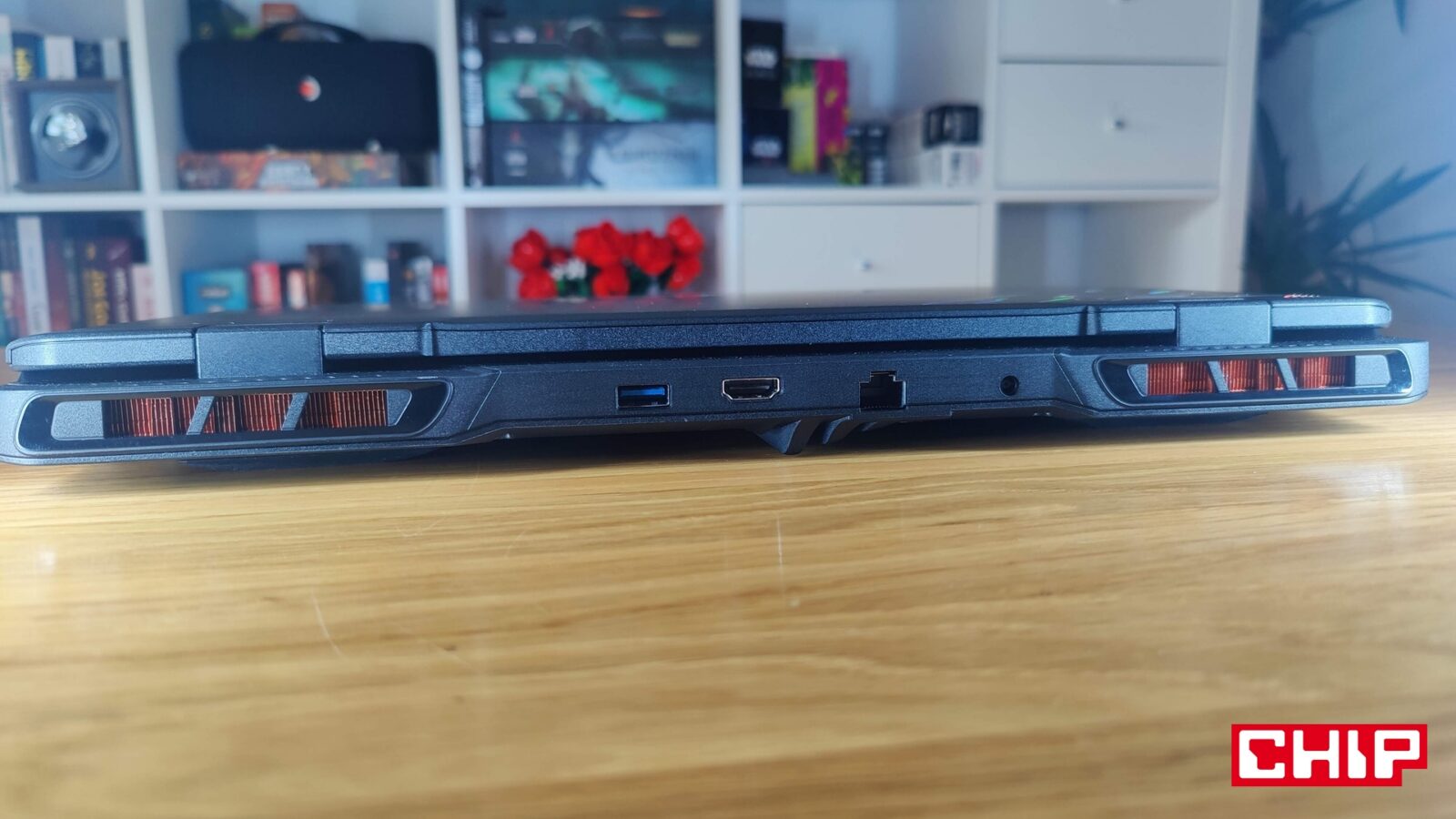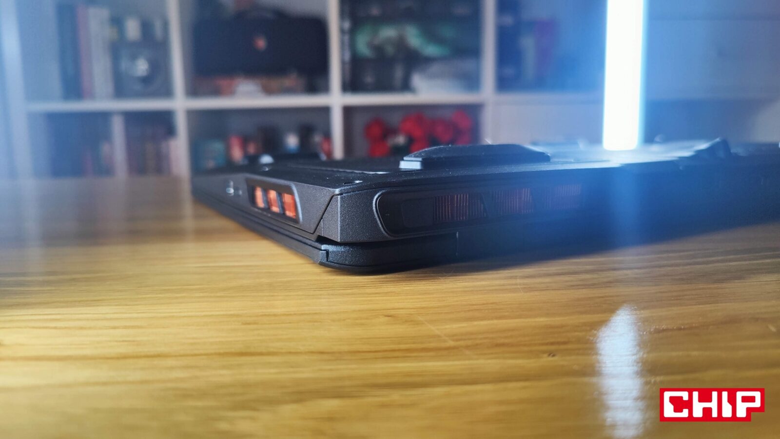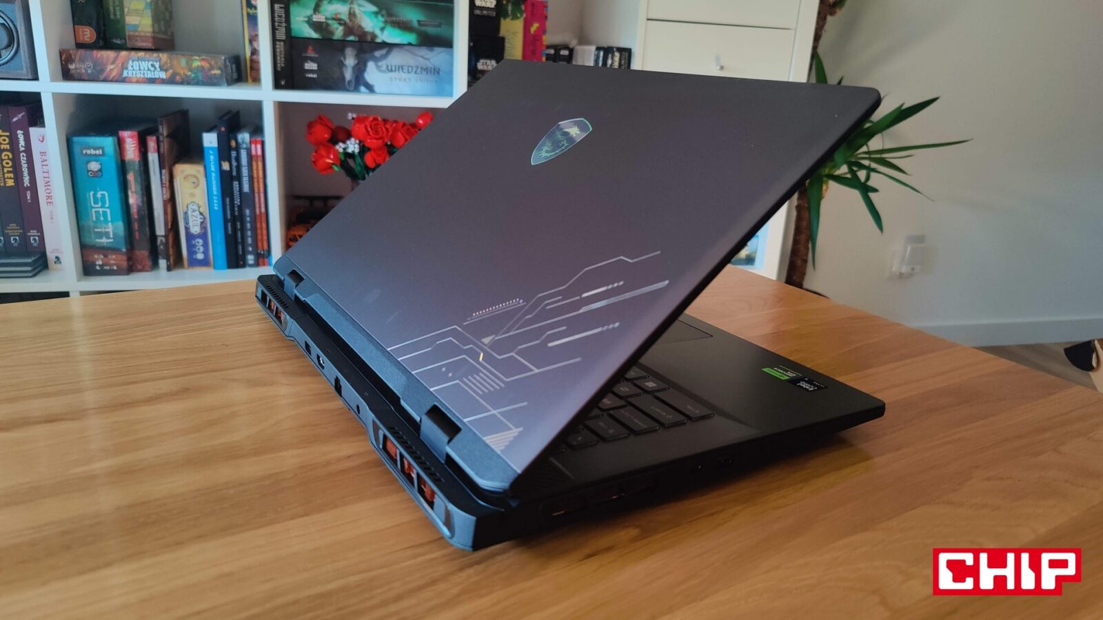 Musicie też mieć z tyłu głowy, że gabaryty laptopa i forma jego obudowy na spodzie nie powstały z myślą o łatwym przenoszeniu go tam i z powrotem, więc jest to ewidentnie “bardziej stacjonarny laptop”. Granie w trybie ekstremalnej wydajności powoduje też rozgrzewanie się układów do temperatury ponad 100 stopni Celsjusza, co przekłada się na odczuwalny w grach spadek płynności, choć postawienie na mniej agresywne tryby (AI i zrównoważony) sensownie balansuje wydajnością oraz poziomem hałasu, co potwierdzają testy porównawcze w Cyberpunku 2077. Cichy to ten sprzęt jednak po prostu nie jest, więc dobre słuchawki to podstawa.
