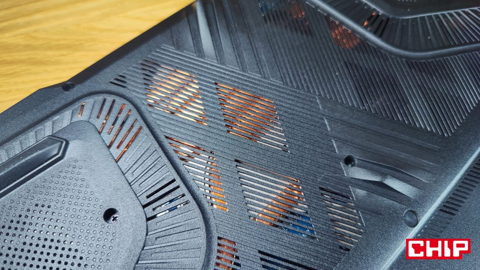 Podstawa obudowy to również twardy, solidny kawał plastiku i nie można odmówić mu charakteru. Tyczy się to zarówno wielkich perforacji, przez które widać praktycznie całe chłodzenie i wentylatory, jak i wielkich czterech gumowych stópek antypoślizgowych. Projekt jest więc typowy – chłodne powietrze jest pobierane przez laptop ze spodu i “oddawane” zarówno do tyłu, jak i na boki (prosto na dłoń znajdującą się na myszce.
