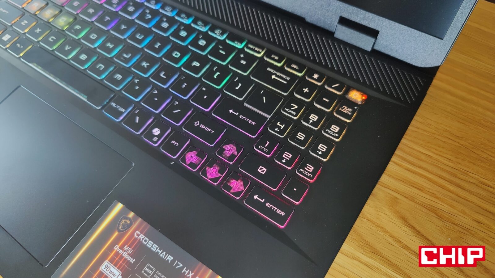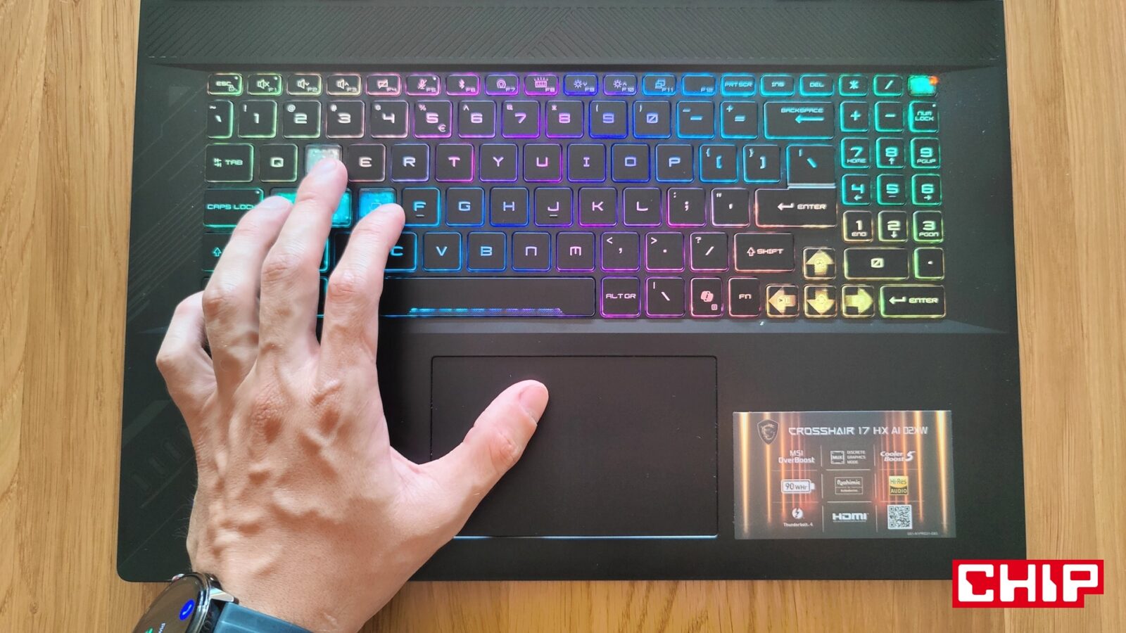 Klawiatura wyspowa z pełnym blokiem numerycznym oferuje 1,7 mm skoku i 24-strefowe podświetlenie RGB sterowane w MSI Center. WASD i strzałki mają półprzezroczyste nakładki, a przycisk zasilania jest podświetlany i pełni rolę diody stanu. Układ jest funkcjonalny i dosyć standardowy, choć musicie wiedzieć, że klawisz Enter w bloku numerycznym został przez producenta ulokowany nieco bliżej strzałek.